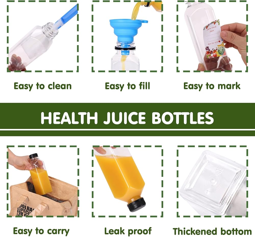 عبوة قيمة: تتضمن العبوة 12 زجاجة بلاستيكية و12 زجاجة مع أغطية سوداء مقاومة للعبث وملصق وقمع وفرشاة. غطاء مقاوم للعبث يضمن عدم عبث أحد بمشروبك، مما يجعل مشروبك أكثر صحة. زجاجات العصير الخاصة بنا سهلة التنظيف وقابلة لإعادة الاستخدام.