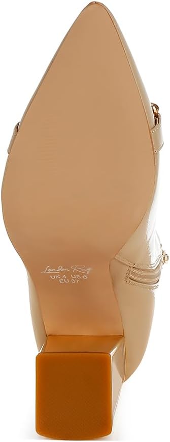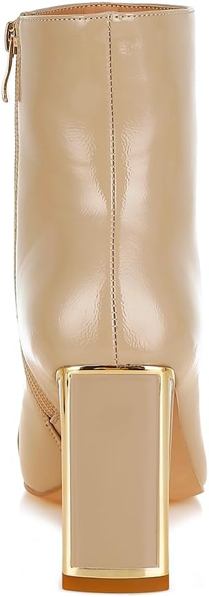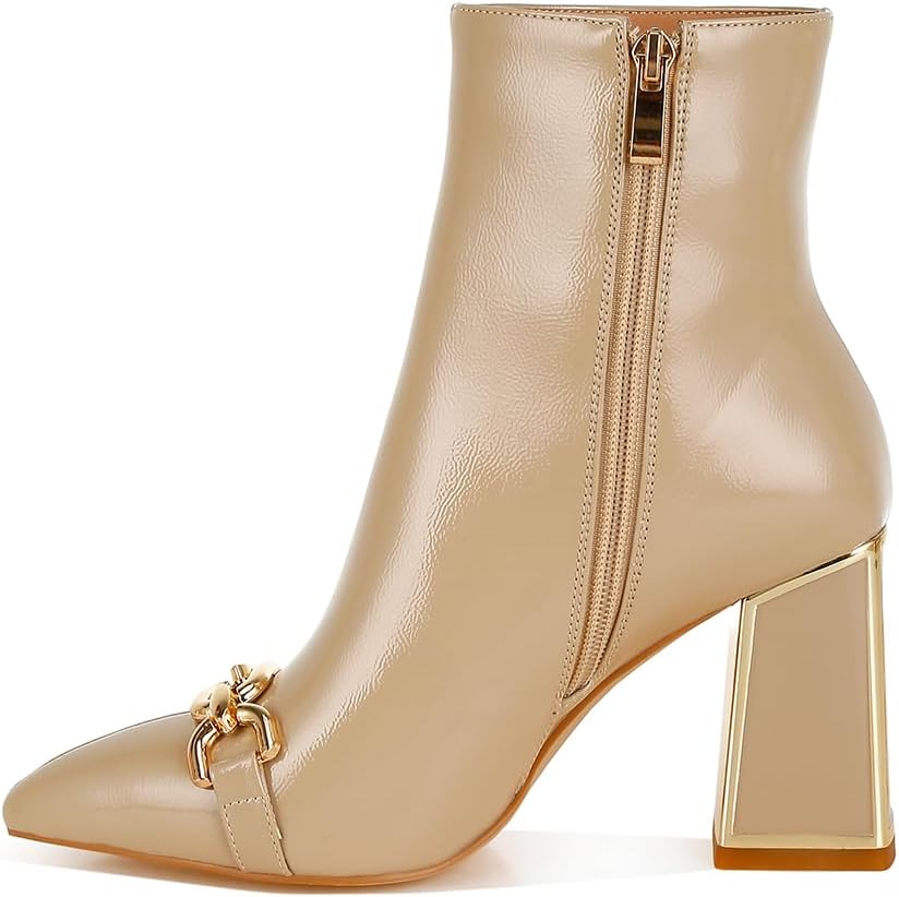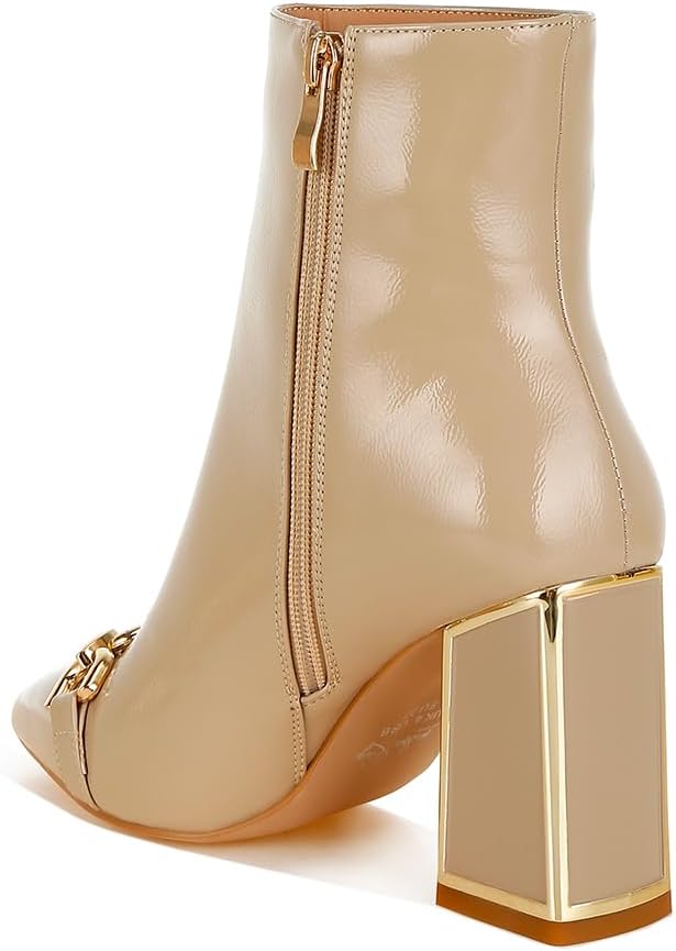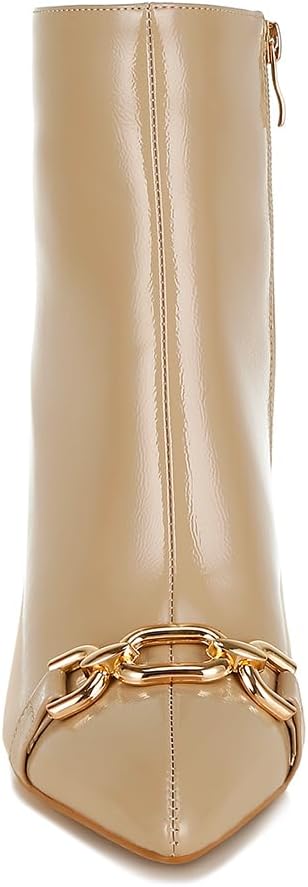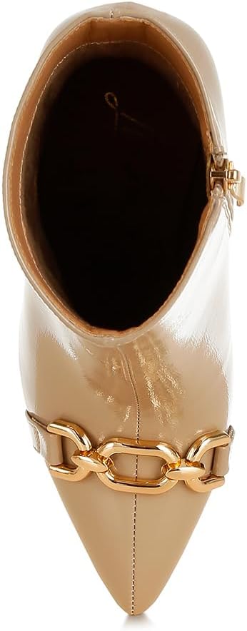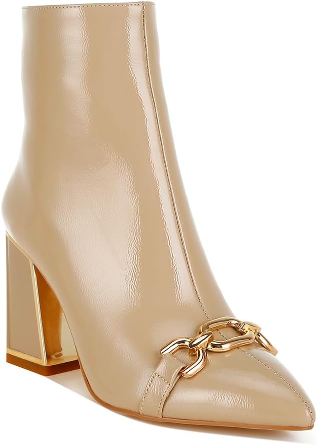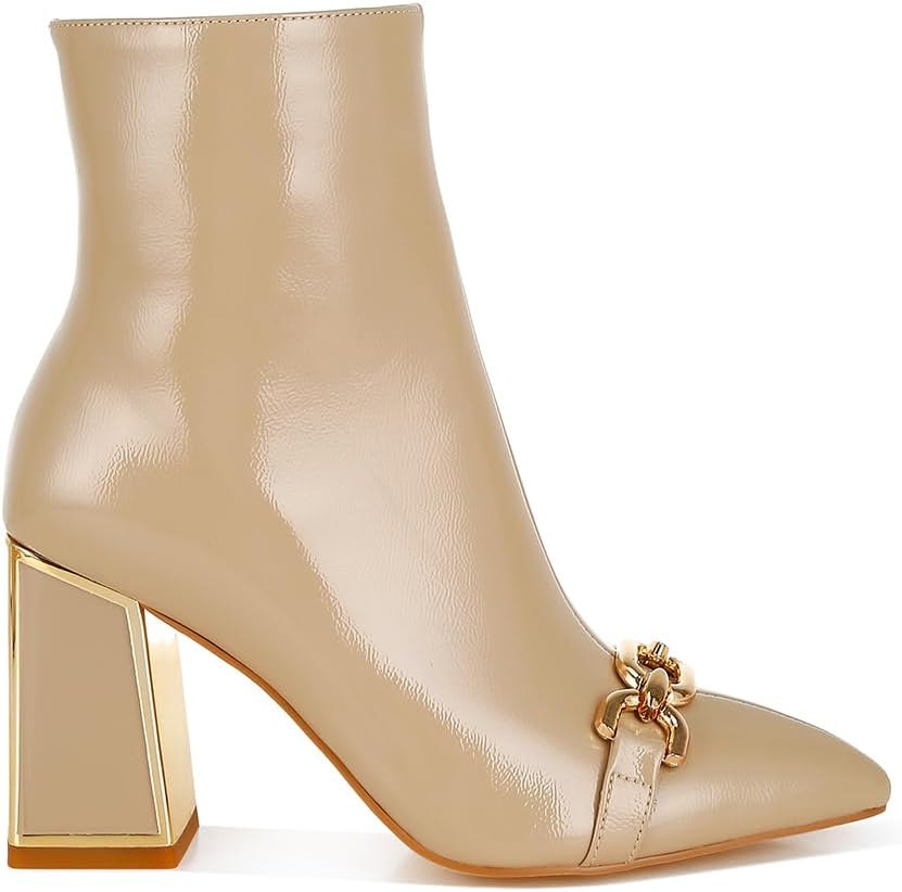 The shiny boots have a patent faux leather upper which is durable while the metallic chain detail accentuates the visual aesthetic of the boots. The metallic detail on the block heels is stylish while the comfortable cushion insoles cut strain and offer a relaxed fit for the feet.