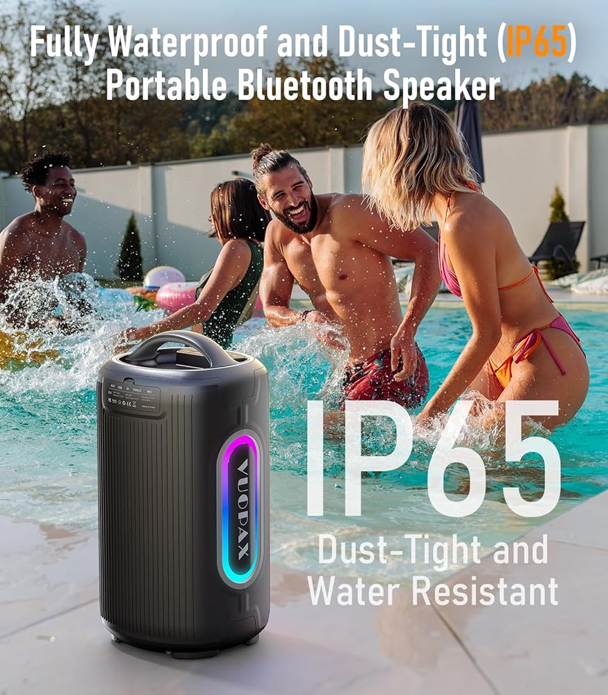 • 𝟏𝟐-𝐇𝐨𝐮𝐫 𝐁𝐚𝐭𝐭𝐞𝐫𝐲 𝐋𝐢𝐟𝐞 & 𝐈𝐏𝐗𝟓 𝐖𝐚𝐭𝐞𝐫𝐩𝐫𝐨𝐨𝐟: مكبرات صوت بلوتوث محمولة مزودة ببطارية عالية السعة، توفر ما يصل إلى 12 ساعة من التشغيل المستمر عند الشحن الكامل. بالإضافة إلى ذلك، فهو يتميز بمقاومته للماء والغبار بمعيار IPX5، سواء كان ذلك في حفلة أو في الهواء الطلق أو على الشاطئ أو بجوار حمام السباحة، فهو رفيقك الموسيقي الأكثر موثوقية في جميع الأحوال الجوية.