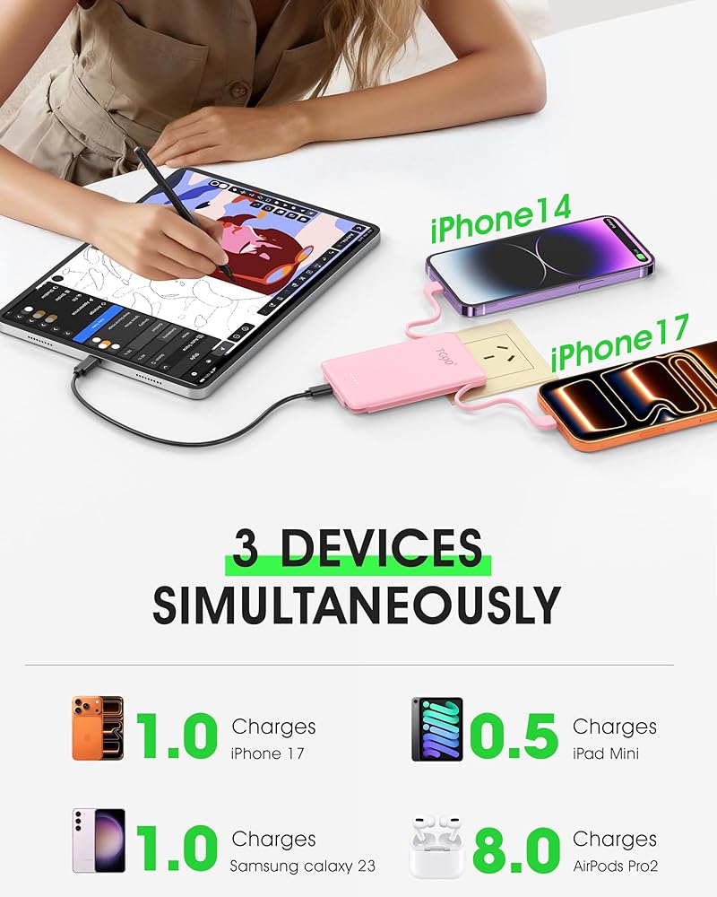 حزمة بطارية خارجية لأجهزة متعددة: يتميز شاحن الهاتف المحمول الصغير TG90 بـ 3 منافذ إخراج، بما في ذلك كابلين مدمجين ومنافذ USB-C/USB-A إضافية، مما يدعم الشحن المتزامن لما يصل إلى 3 أجهزة. متوافق تمامًا مع مجموعة واسعة من الهواتف والأجهزة اللوحية والأجهزة الأخرى التي تعمل بالطاقة عبر USB