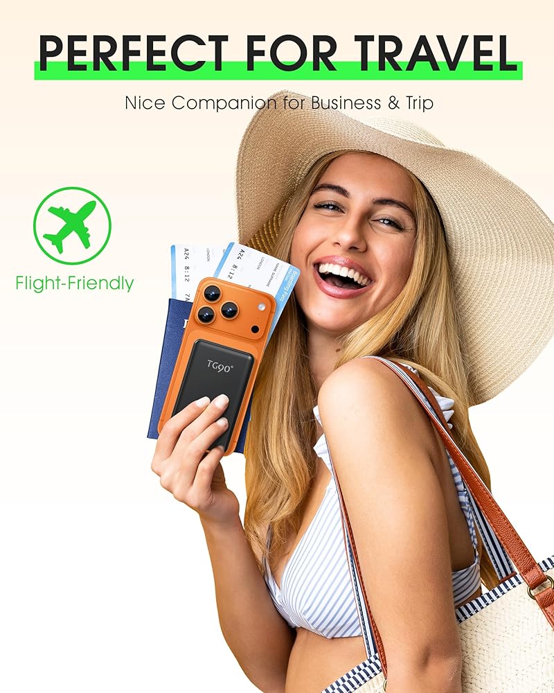 شاحن محمول خفيف الوزن للغاية بوزن 0.29 رطل لهاتف iPhone: يزن بنك الطاقة TG90 خفيف الوزن 0.29 رطل فقط، بأبعاد 4.4 بوصة × 2.68 بوصة × 0.65 بوصة (حجم بطاقة الائتمان تقريبًا)، مما يجعله أقصر من هاتف iPhone وخفيف بما يكفي لاستخدامه بشكل مريح أثناء الشحن. ينزلق دون عناء في جيبك أو حقيبتك الصغيرة، مما يجعله ضروريًا للغاية للسفر