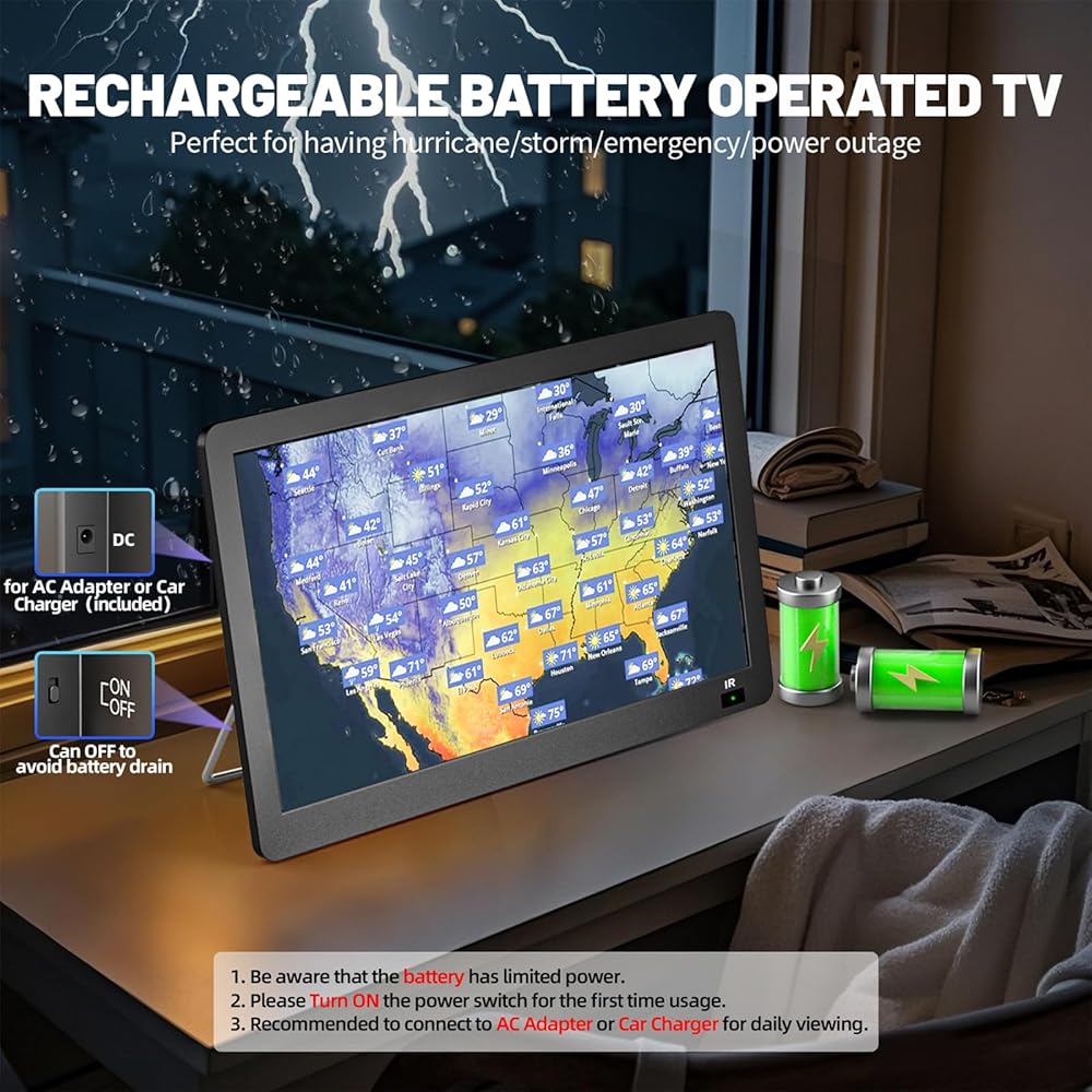تلفزيون قابل لإعادة الشحن: شاهد المحتوى المفضل لديك حتى أثناء انقطاع التيار الكهربائي أو الرحلات خارج الشبكة. بطارية مدمجة قابلة لإعادة الشحن توفر ما يصل إلى 3 ساعات من وقت التشغيل. يشتمل على محول طاقة تيار متردد وشاحن سيارة للاستخدام الداخلي والخارجي المرن. يرجى الشحن بالكامل قبل الاستخدام الأول