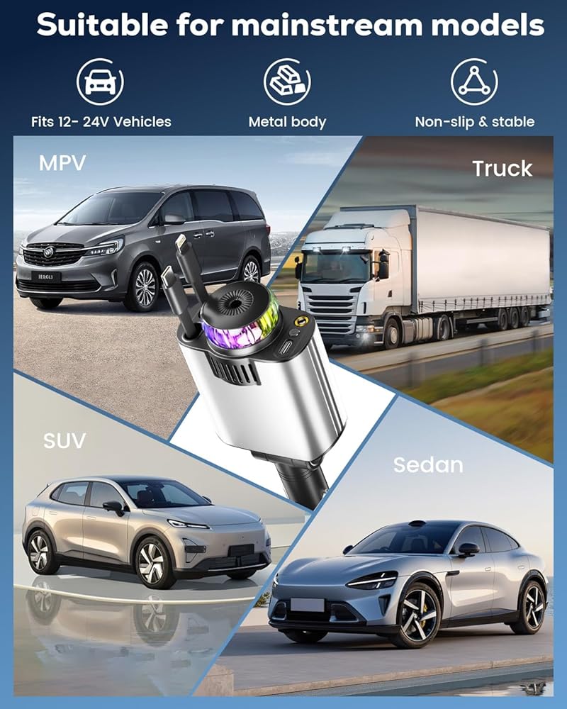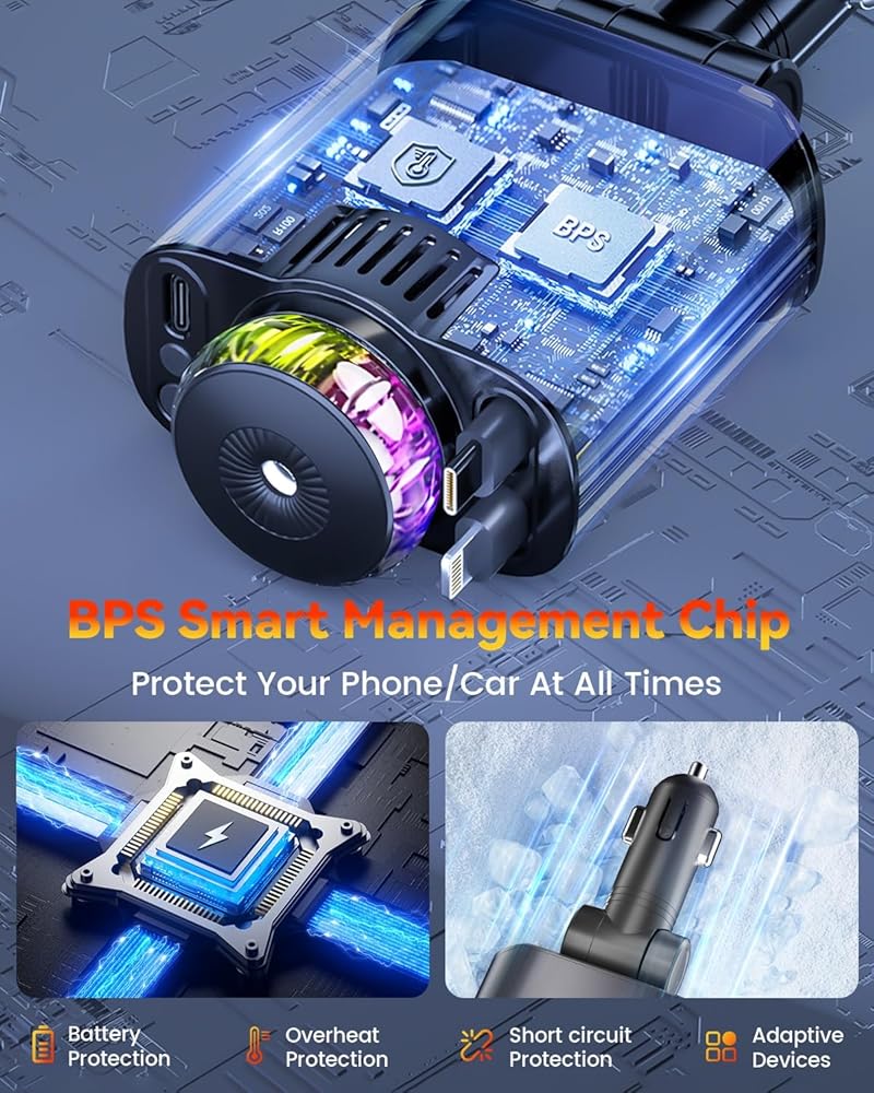 • شاحن هاتف السيارة متعدد المنافذ USB-C: مزود بمنافذ PD 30W USB-C ومنافذ من النوع C وكابل iOS قابل للسحب، فهو يوفر خيارات شحن سريعة ومرنة ويمكنه شحن ما يصل إلى ثلاثة أجهزة في وقت واحد. مثالي لمحبي السيارات أو سائقي الشاحنات الذين يبحثون عن شاحن سيارة USB قابل للسحب، وهو خيار عملي لترقية ملحقات السيارة. وهو يدعم بروتوكولات شحن الأجهزة المتعددة، بما في ذلك الشحن السريع USB C لجهاز iPhone 16 Pro Max والأجهزة اللوحية وغيرها من الأجهزة الإلكترونية الصغيرة. إنه مثالي لمستخدمي أجهزة iPhone وAndroid المتعددة أو لعشاق التكنولوجيا.