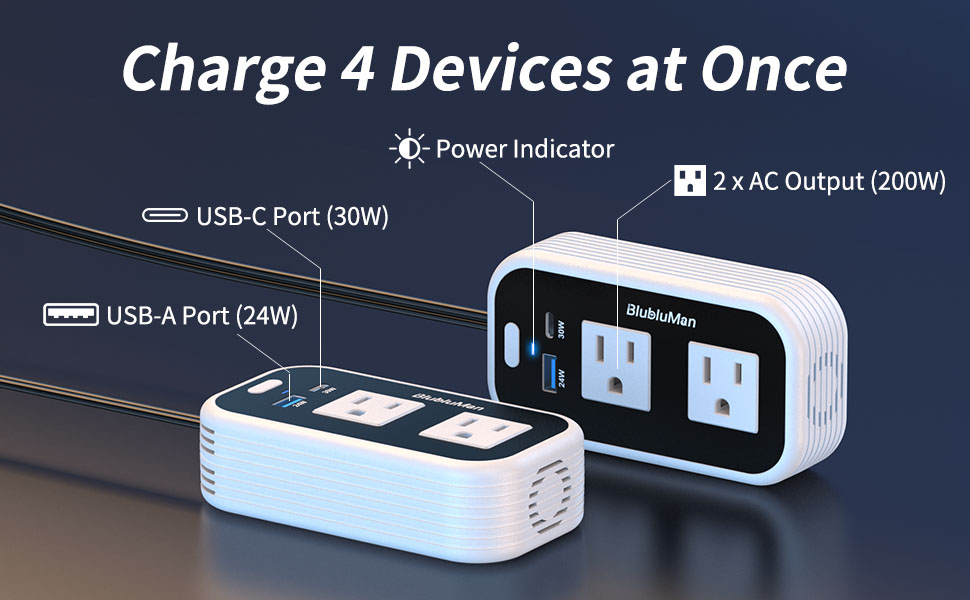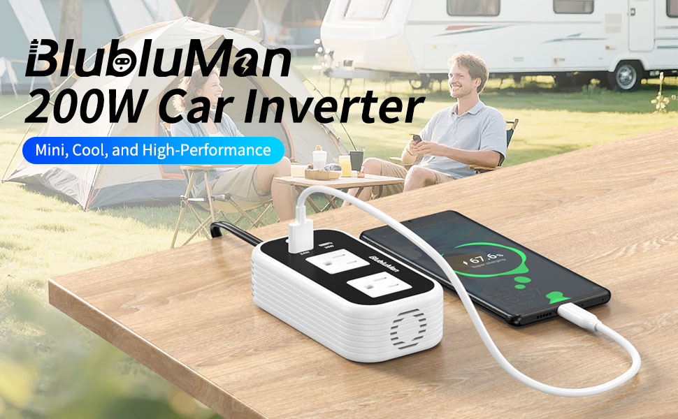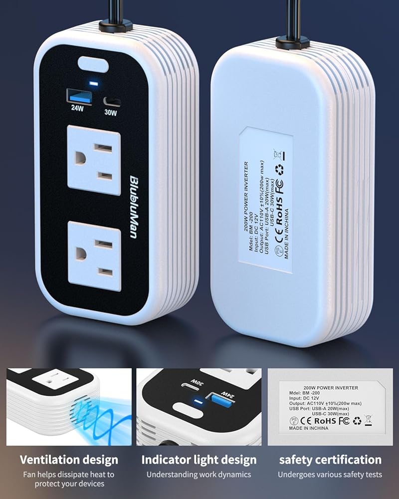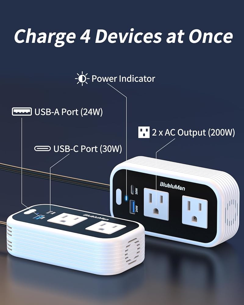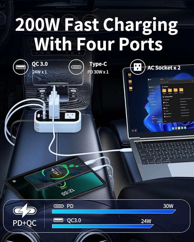 عاكس طاقة السيارة 200 واط، Blubluman DC 12V إلى 110V AC مخرج محول قابس السيارة مع شاحن PD 30W، شاحن سريع QC3.0 24W، عاكس طاقة للمركبات، منفذ لشاحن الكمبيوتر المحمول