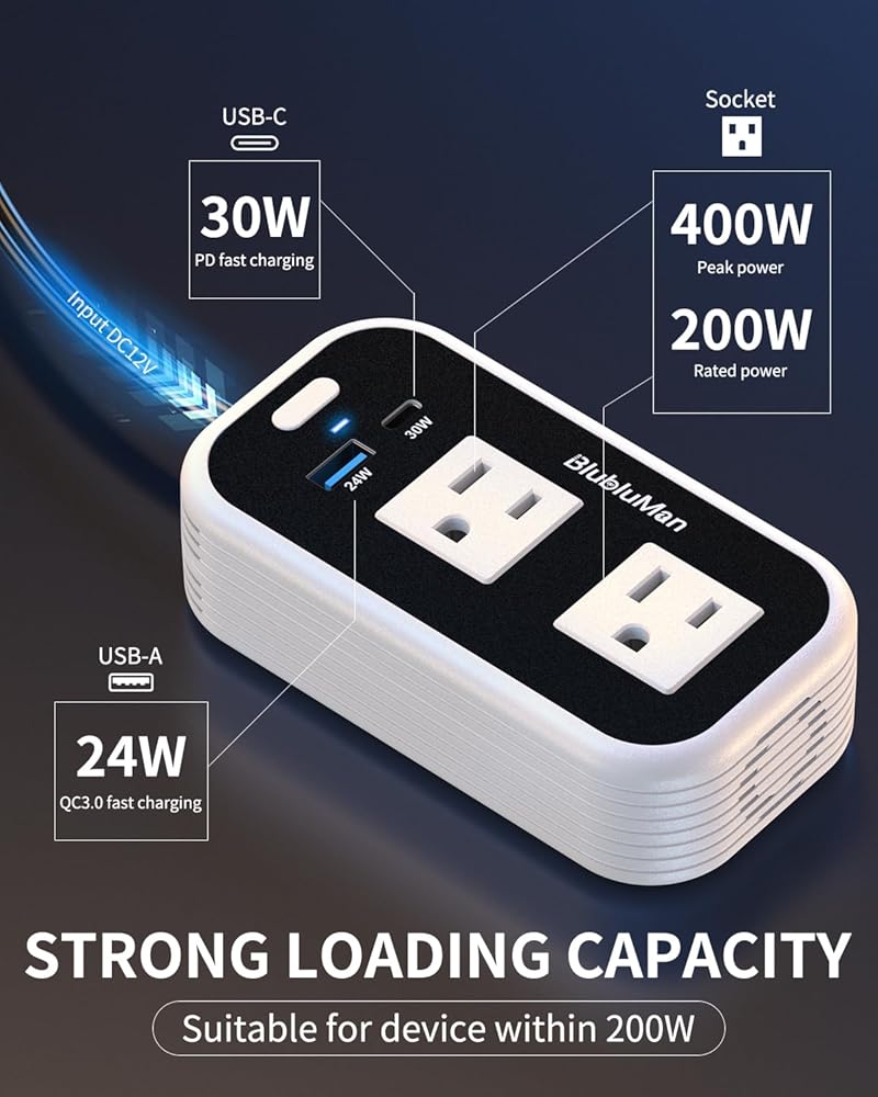 【طاقة مستمرة 200 واط】 يتميز محول طاقة السيارة بقدرة 200 واط هذا بمنافذ تيار متردد 110 فولت قياسية 2 × الولايات المتحدة، ومنفذ شاحن PD 1 × 30 واط، ومنفذ USB لشاحن سريع 1 × 24 واط QC3.0، ومحول تيار مستمر 12 فولت إلى تيار متردد 110 فولت، وعاكس طاقة للمركبات، رائع لأجهزة الكمبيوتر المحمولة، والأجهزة اللوحية، والهواتف المحمولة، والمراوح، وهدايا عيد الميلاد، وسلاسل الإضاءة، ووحدة التحكم في الألعاب، والأجهزة الإلكترونية الأخرى