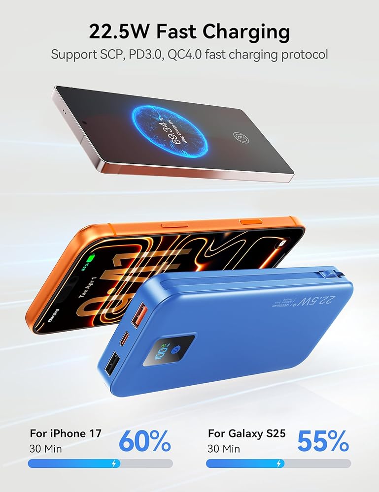 ▸شاحن محمول عالي السعة 12000 مللي أمبير في الساعة يوفر 2.4 رسوم لجهاز iPhone 17، أو 2.9 رسوم لجهاز iPhone 17 Air، أو 1.2 رسوم لجهاز iPad Air 5، أو 2.3 رسوم لجهاز Samsung S24. يعمل بنك الطاقة سريع الشحن بقدرة 22.5 وات على شحن بطارية هاتفك من 0% إلى 60% في 30 دقيقة فقط، وهو مثالي لعمليات الشحن السريعة أثناء الروتين الصباحي أو الاجتماعات أو الانتظار في المطار - لا مزيد من جلسات الشحن الطويلة