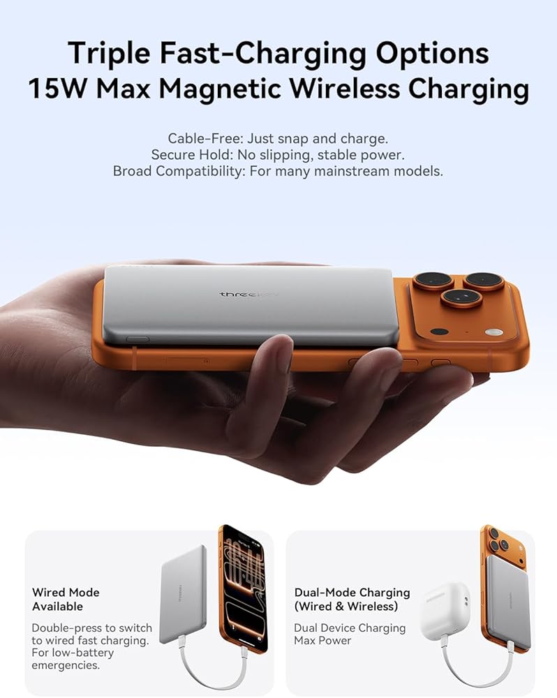 ⚡【شحن سلكي سريع بقدرة 15 واط و22.5 واط】يأتي مزودًا بلوحة شحن لاسلكية بحد أقصى 15 واط ومنفذ USB-C بحد أقصى 22.5 واط - مما يحول بنك الطاقة Magsafe هذا إلى أداة متعددة الأغراض لأجهزتك. سواء كنت تستخدمه لشحن جهاز iPhone الخاص بك لاسلكيًا أو تشغيل الأدوات الذكية من خلال منفذ USB-C، يمكنك شحن أجهزتك بسهولة، سواء في المنزل أو أثناء التنقل.