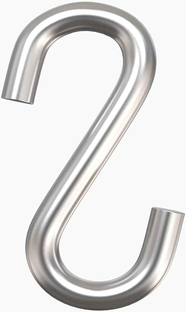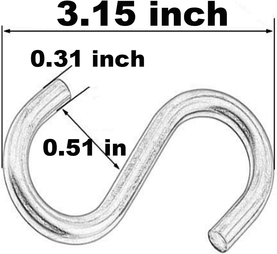 أبعاد الخطافات على شكل حرف S: الخطافات تقريبًا الطول الكلي 7.5 سم/ 3 انش، سمك الخط 8 ملم/ 0.32 انش، فتحة نهاية الخطاف 15 ملم/ 0.6 انش عرضًا وقطر حلقة الخطاف تقريبًا. 20 ملم/ 0.8 انش.