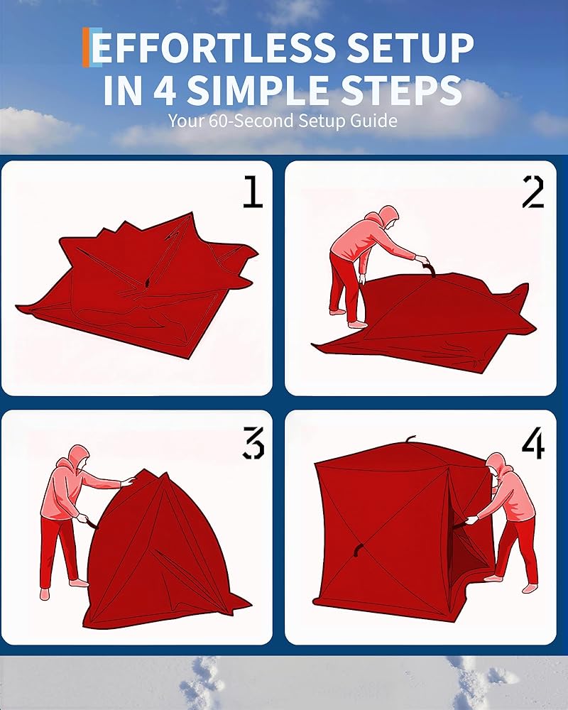 Effortless Quick Setup System: Featuring a pre-assembled hub structure, this ice shelter can be fully set up in under 60 seconds, delivering immediate protection from freezing conditions without requiring tools or complex installation steps.