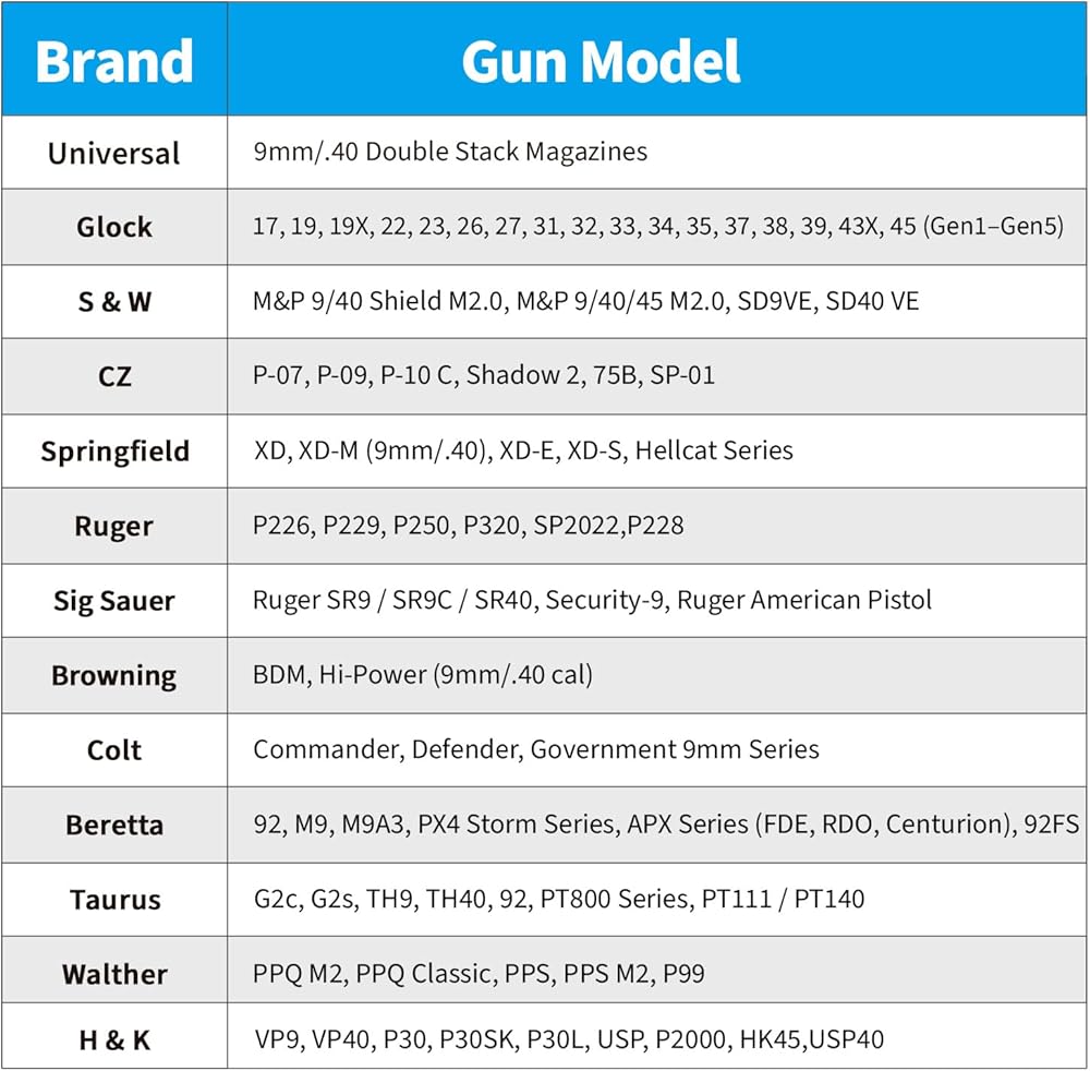 ★【يناسب معظم الأكواب المزدوجة مقاس 9 مم/.40】مصممة لتناسب الموديلات المشهورة مثل Glock 17/19، وSig P365، وHellcat Pro، والمزيد. متوافق مع المجلات المزدوجة مقاس 9 مم/.40 (انظر صورة الحجم قبل الشراء).