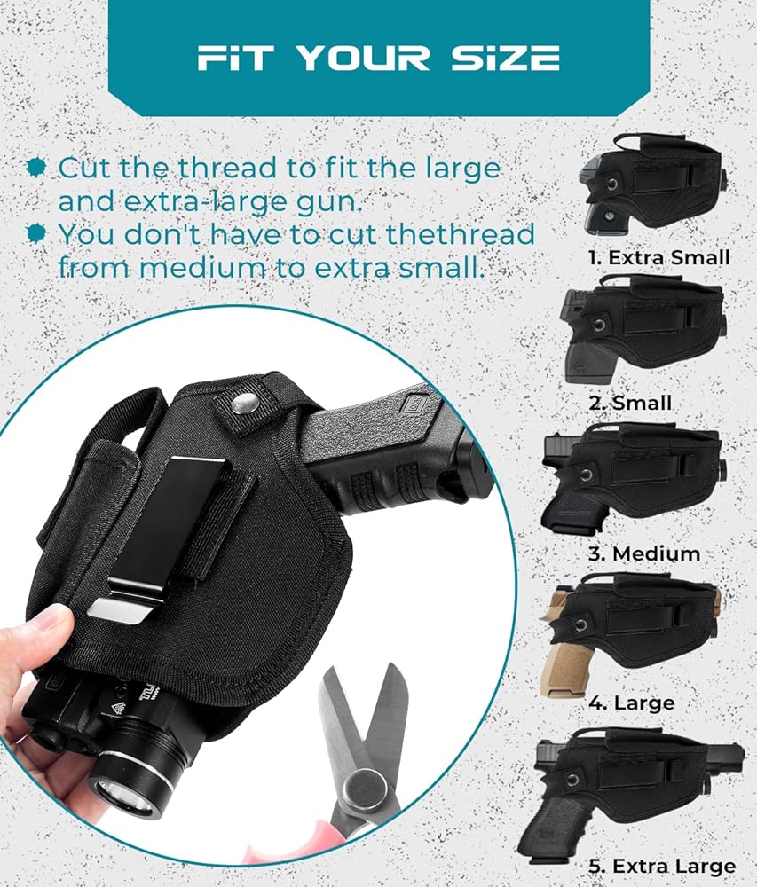【ملاءمة عالمية】تم تصميم حافظة المسدس العالمية LandFoxtac لتناسب مجموعة واسعة من أحجام المسدس، بما في ذلك الموديلات الشائعة مثل Glock 17 و19 و23 و38 والمزيد. وهو متوافق أيضًا مع مسدسات 1911، وSig Sauer، وS&W، وRuger، وBeretta، وغيرها من المسدسات 9 مم، و380، و45ACP.