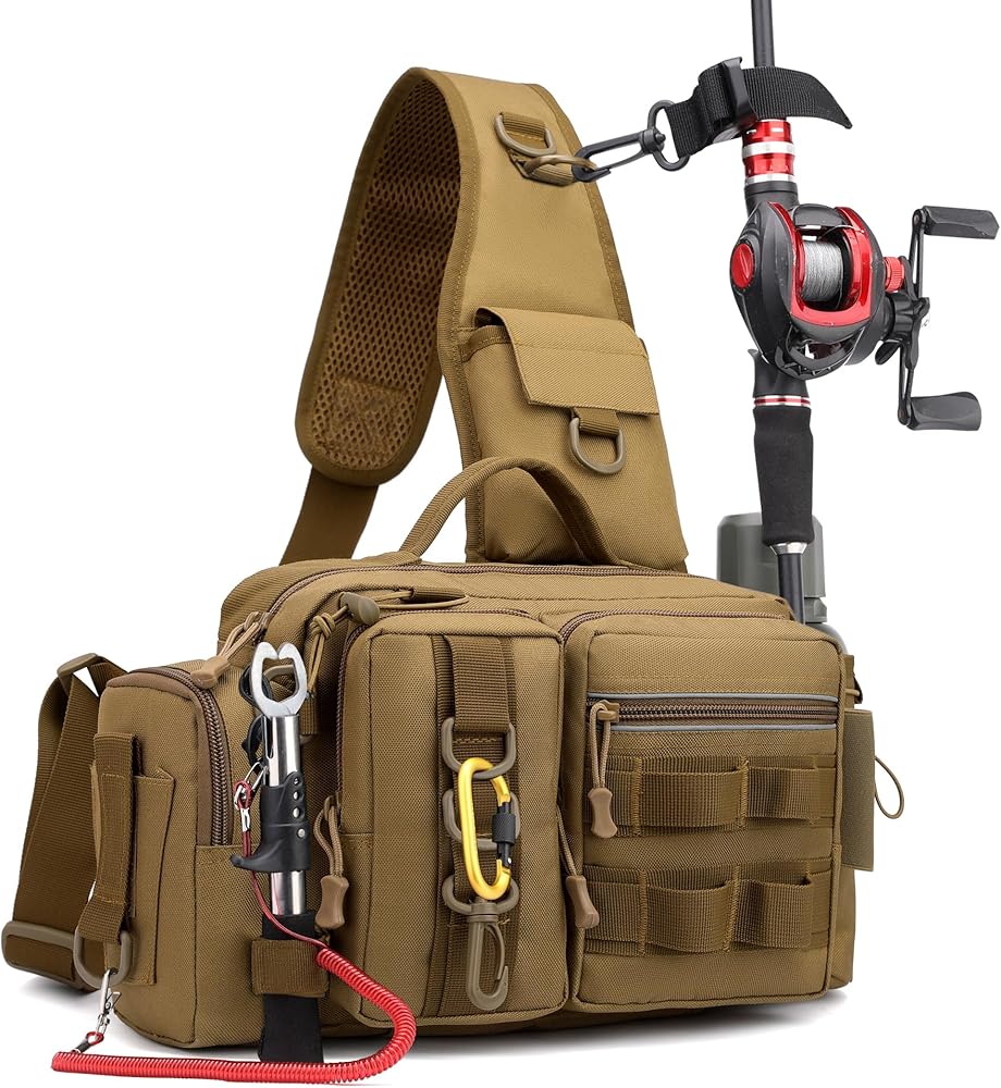 حقيبة تخزين أدوات صيد الأسماك - حقيبة خصر مع أشرطة كتف عريضة قابلة للتعديل، 12 حجرة لمعدات الصيد والطُعم والخطافات والإكسسوارات، متينة وخفيفة الوزن للصيادين في الهواء الطلق، كاكي