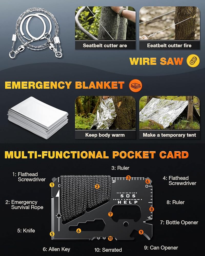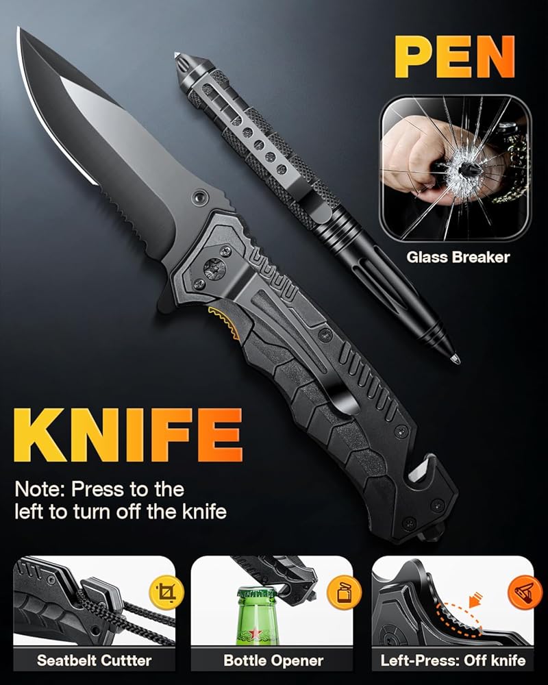 • 【خدمة مدروسة】مجموعة النجاة هذه هي الطريقة المثالية لإظهار حبك لوالدك/زوجك/صديقك. إذا لم يلبي توقعاتك أو كان لديك أي أسئلة، يرجى الاتصال بنا. سنبذل قصارى جهدنا لحل أي مشكلات، مما يضمن حصولك على هذه الهدية الثمينة براحة بال تامة.