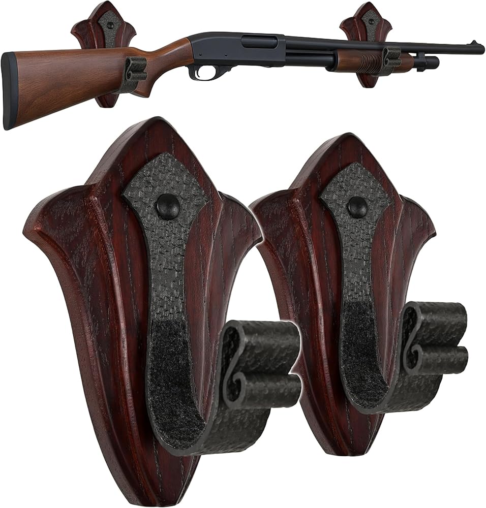 [خشب صلب صلب وفولاذ قوي] مصنوع من الخشب الصلب الفاخر والفولاذ عالي التحمل. الجزء الداخلي من كل خطاف مبطن بلباد ناعم لحماية سلاحك الناري من الخدوش والانزلاق.