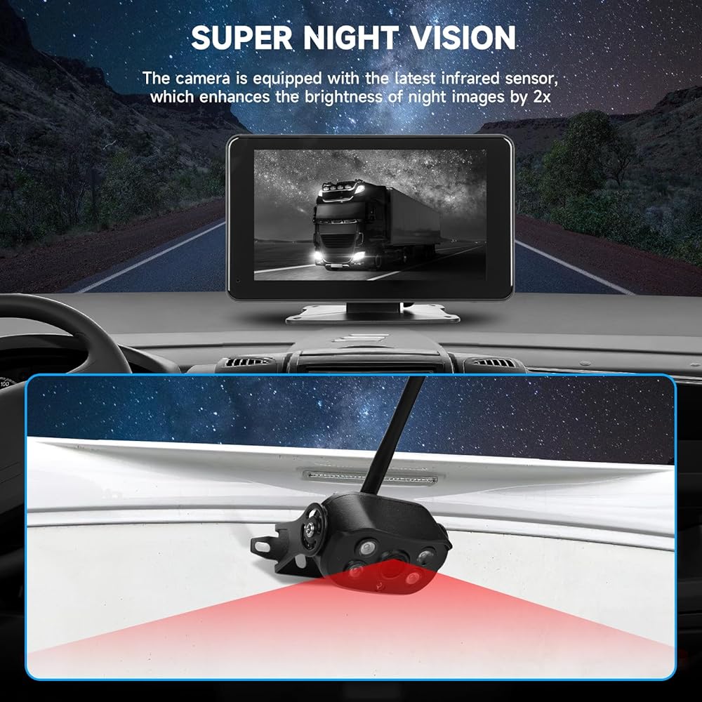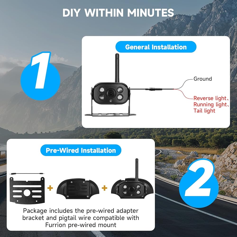 ⚠️ ملاحظة مهمة - بينما يتم نقل إشارة الفيديو بين الكاميرا والشاشة لاسلكيًا، تتطلب كل من الكاميرا والشاشة اتصالاً سلكيًا بالطاقة لتعمل. هذا المنتج لا يعمل بالبطارية. يرجى التأكد من أن سيارتك لديها مصدر طاقة مناسب 12 فولت متاح للتركيب.