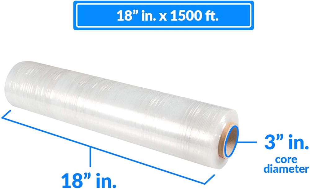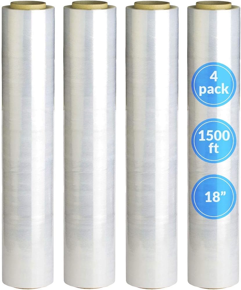 [صنع في الولايات المتحدة الأمريكية] ريلي. 4 رول | غلاف مطاطي مقاس 18 بوصة (1500 قدم/لفة) غلاف شفاف قابل للانكماش/غلاف بلاستيكي قابل للتمدد للتحرك - فيلم مطاطي ملتصق بمنصة بلاستيكية - فيلم مطاطي مقاس 18 بوصة للتحرك والتخزين