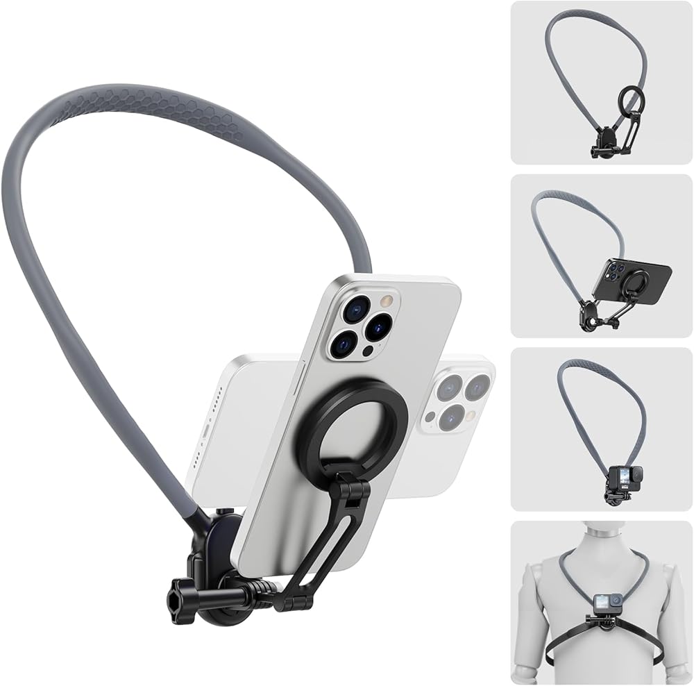 حامل هاتف مغناطيسي للرقبة، حامل هاتف على الصدر بدون استخدام اليدين POV/Vlog مع حزام، يستخدم للتسجيل/الطبخ/ركوب الدراجات، متوافق مع iPhone، Android، GoPro، Insta360 (رمادي)