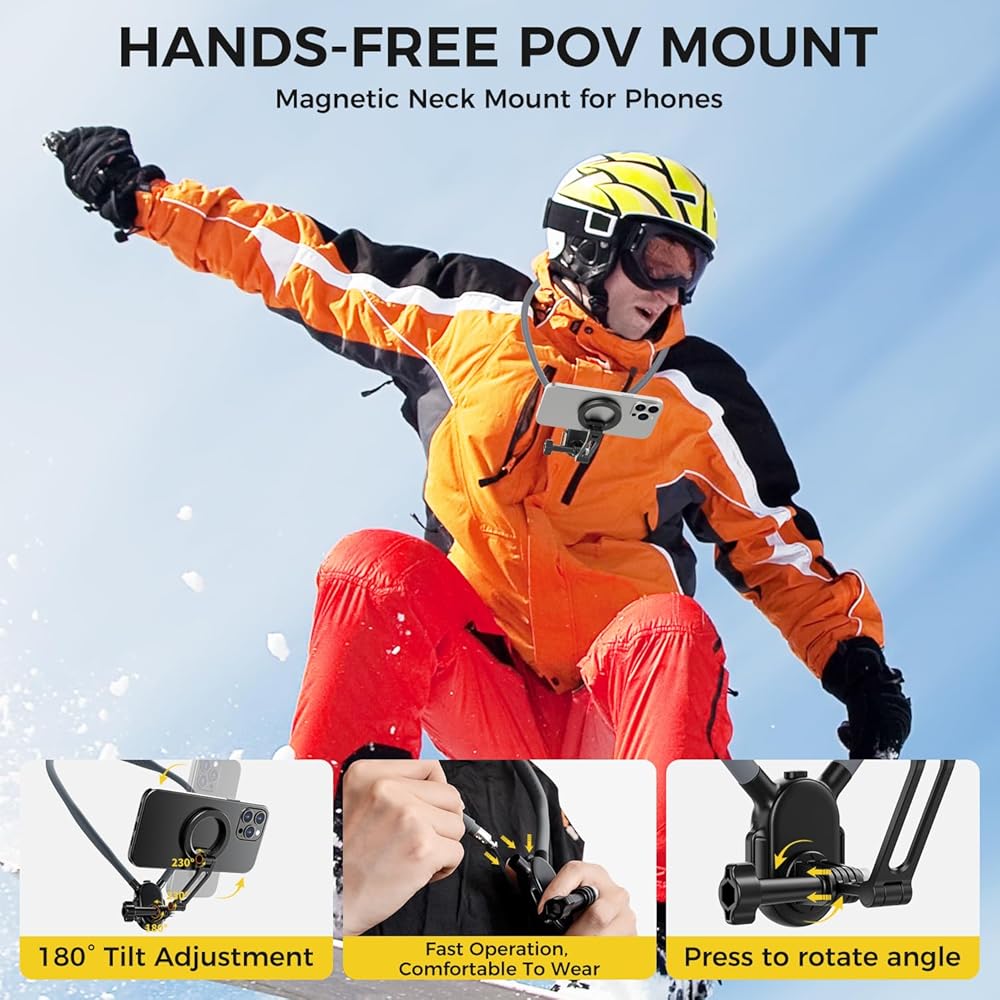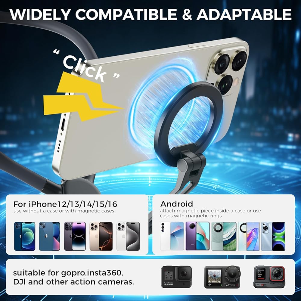 【متوافق على نطاق واسع مع كاميرات الحركة】متوافق مع iPhone16، iPhone 16 Plus، iPhone 16 Pro، iPhone 16 Max، iPhone 15، iPhone 15 Plus، iPhone 15 Pro، iPhone 15 Pro Max، iPhone 14، 14 Pro، iPhone 13، 13 Pro، 13 Mini، 13 Pro Max، 12، 12 Pro، 12 Mini، 12 Pro Max. ملحوظة: إذا كان طراز هاتفك الخلوي هو السلسلة المذكورة أعلاه، فيرجى استخدام حامل الرقبة بدون حافظة. ملاحظة: إذا كان هاتفك الخلوي هو المذكور أعلاه بدون مغناطيس، فيرجى استخدامه بعد ارتداء الحافظة وتثبيت القطعة المغناطيسية. كما أنه متوافق مع كاميرات GoPro Hero 12 وInsta360 X4 وDJI Osmo Action 4 وغيرها من الكاميرات