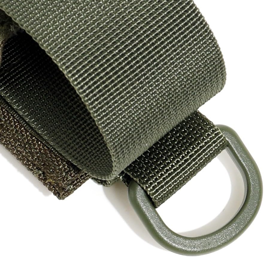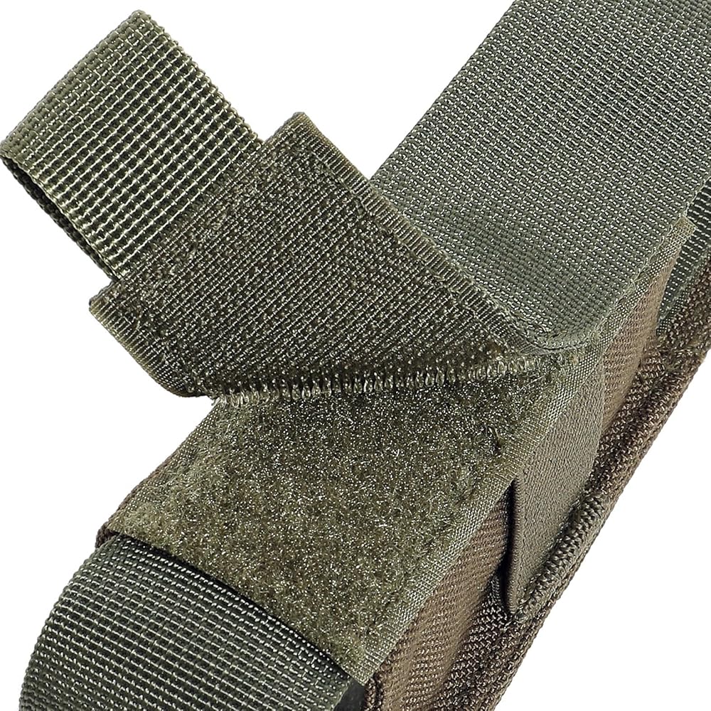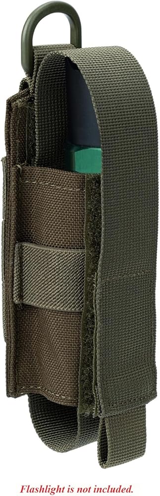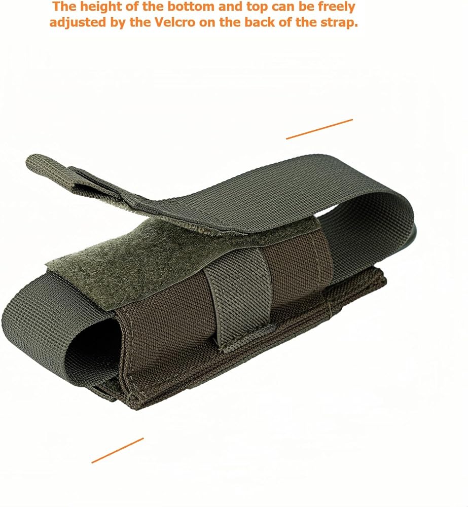 The flap with hook&loop closure, durable and sturdy, also reasonable to open the pouch in a hurry when you need to. And it covers the light/OC completely for protection and won't fall out while running. D-ring at the top provides additional mounting options. Simple to use and portable. Only takes up one row of molle. Both the bottom and top straps' length is adjustable, making it shorter or longer using the velcro inside to fit your content length, only the diameter of the pouch is fixed.