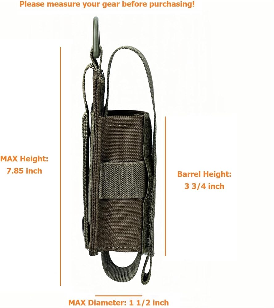 A versatile pouch fit tactical EDC flashlight, MK4 OC spray, tactical knif etc. Note: this accessory pouch fits gears with barrel diameters up to 1.5" and heights up to 7.8". This tactical pouch has a barrel height of 3.75 inches. It also fits the MK3 pepper spray canister, but the flap will be slightly longer. Please measure your gear before purchasing!