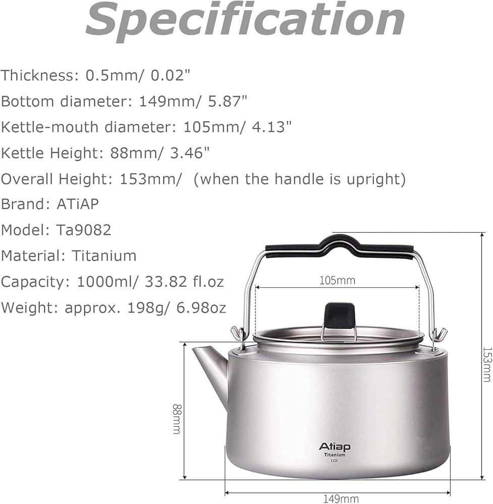 الوزن 5.4 أونصة فقط، السعة: 600 مل/ 20.29 أونصة سائلة، السعة الموصى بها: 0.48 لتر. تأتي مع حقيبة شبكية لسهولة التخزين والحمل. تحتوي العبوة على قطعة واحدة من غلاية تيتانيوم سعة 600 مل وحقيبة فوضى واحدة.