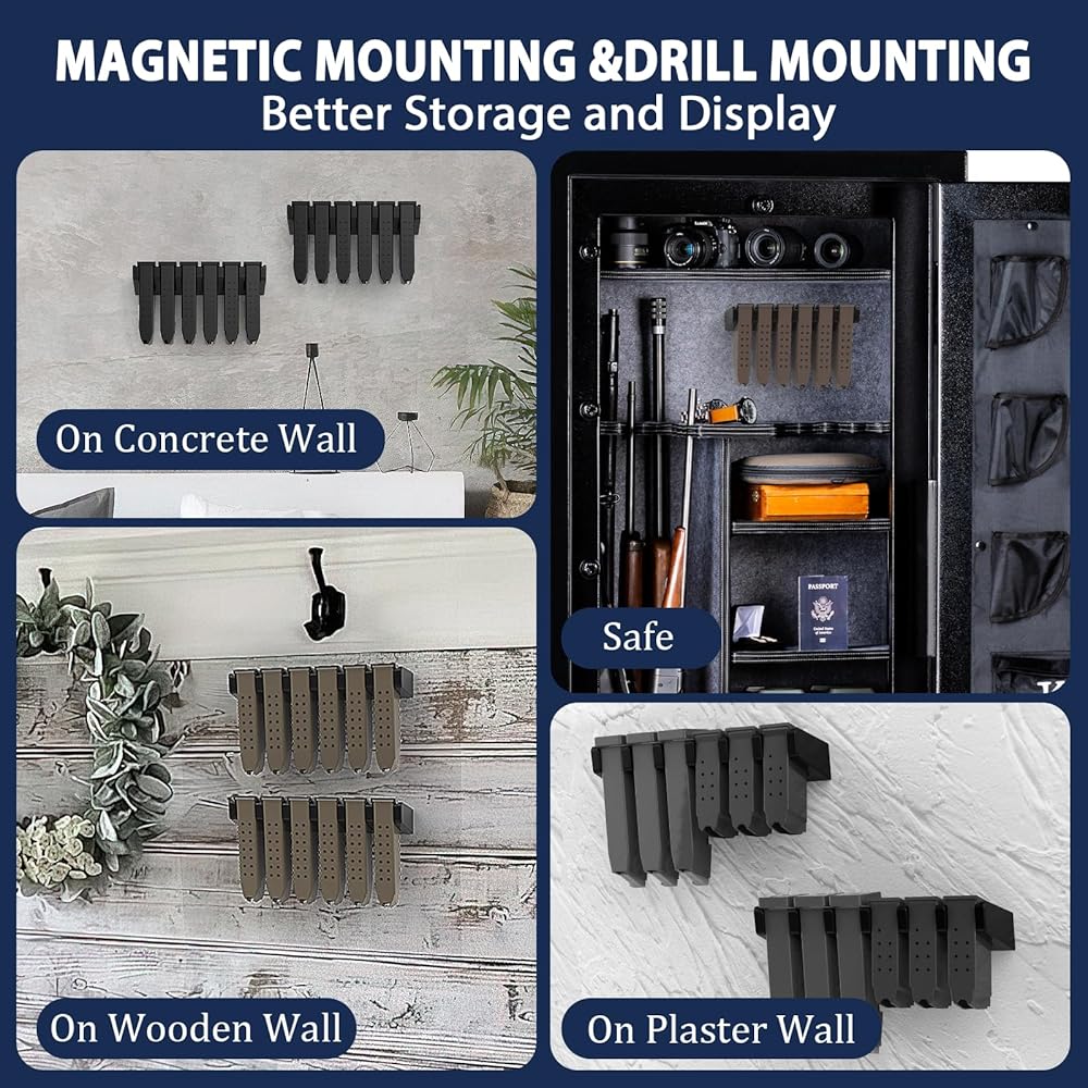 EXTRA LARGE STORAGE SPACE: Unlike other glock magazine mounts that can only hold 3 glock magazines, each of our wall mount glock magazine holder can hold up to 6 fully loaded mags, providing plenty of storage space, and can hold up to 70 pounds. It's a good magazine extension for glock accessories