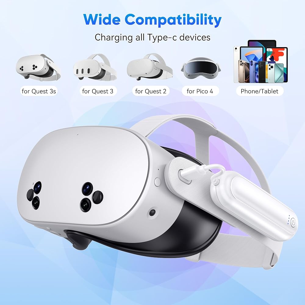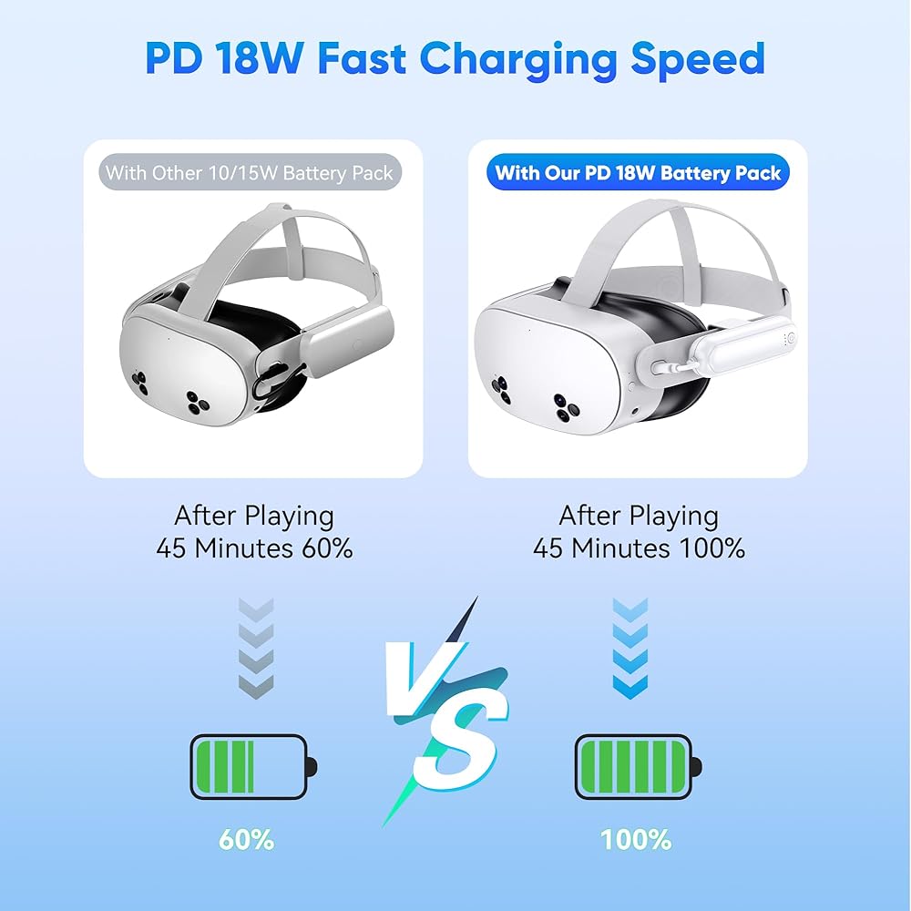 • شحن سريع بمخرج 18 وات: بالمقارنة مع البطاريات الأخرى بقدرة 10 وات/15 وات (والتي يمكنها الاحتفاظ فقط بـ 60% من الطاقة لسماعة الرأس Meta Quest 3S/3 بعد 45 دقيقة من الاستخدام)، فإن حزمة بطارية الشحن السريع بمخرج PD 18 وات مناسبة تمامًا لسماعة Meta Quest 3S/3/2 (لا يزال بإمكانها الاحتفاظ بنسبة 100% من الطاقة 3 لسماعة الرأس Meta Quest 3S/3 بعد 45 دقيقة من الاستخدام)؛ الملحقات المثالية لجهاز Meta Quest 3S/3 لتمديد وقت لعب الواقع الافتراضي