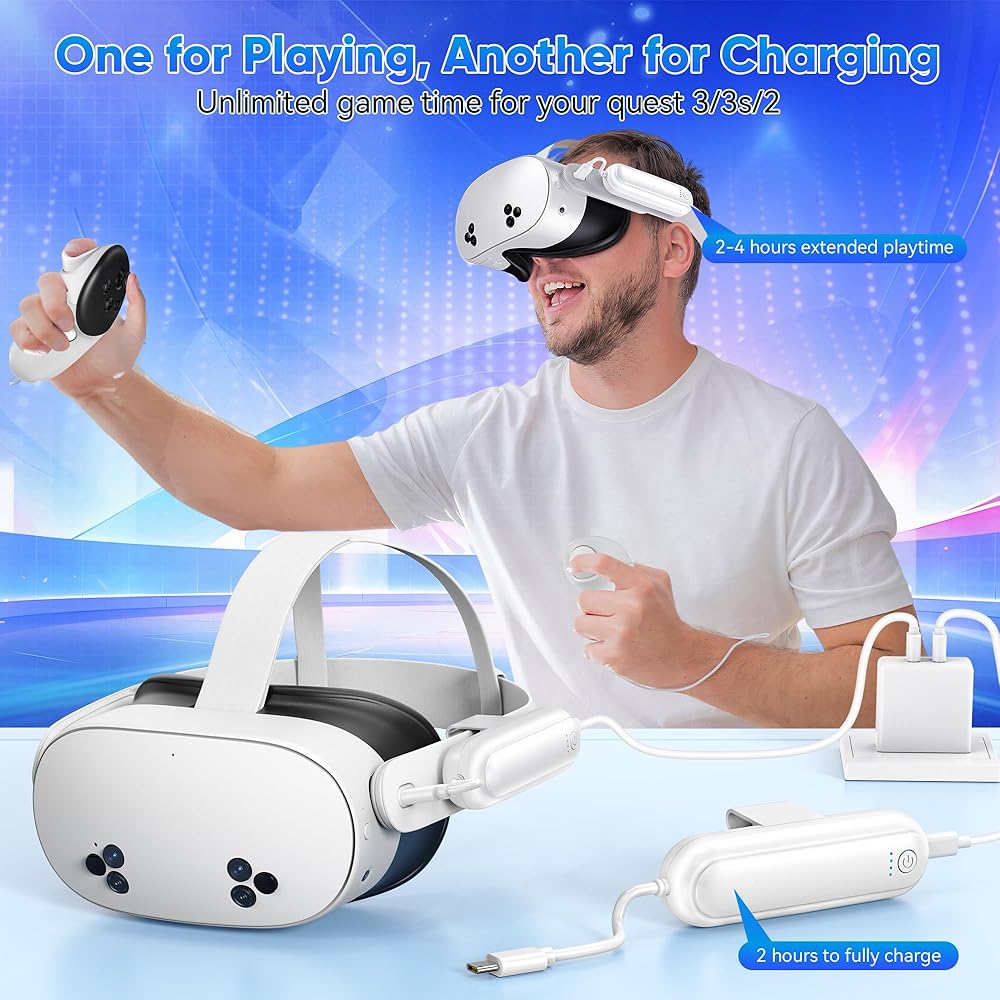 • حزمة بطارية 2*20000 مللي واط في الساعة لـ Meta Quest 3s/3/2: بسعة 20000 مللي واط في الساعة، توفر حزمة بطارية Meta Quest 3s/3/2 2-4 ساعات إضافية من وقت اللعب. مع وجود عبوتين من الشاحن لـ Meta Quest 3s/3/2 Quest 2، فهذا يعني أنه يمكنك الحصول على واحدة للعب، وأخرى للشحن، مما يوفر وقتًا غير محدود لألعاب الواقع الافتراضي، لا مزيد من القلق بشأن نفاد طاقة Meta Quest 3s/3/2، مما يمنحك متعة ألعاب الواقع الافتراضي الغامرة