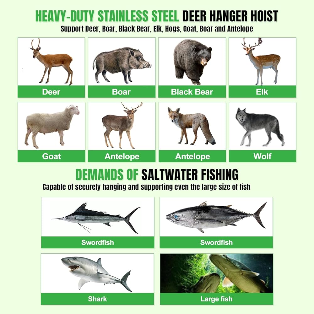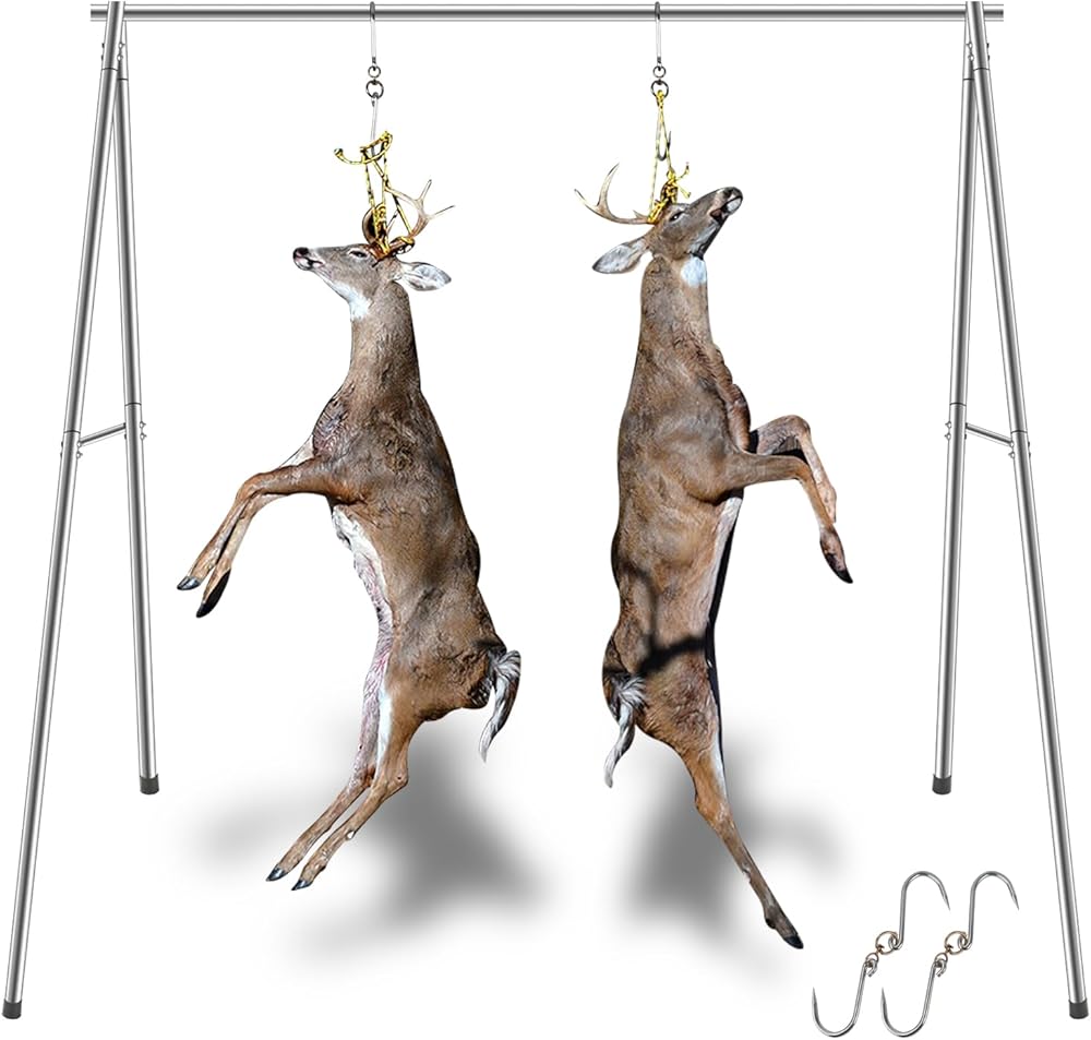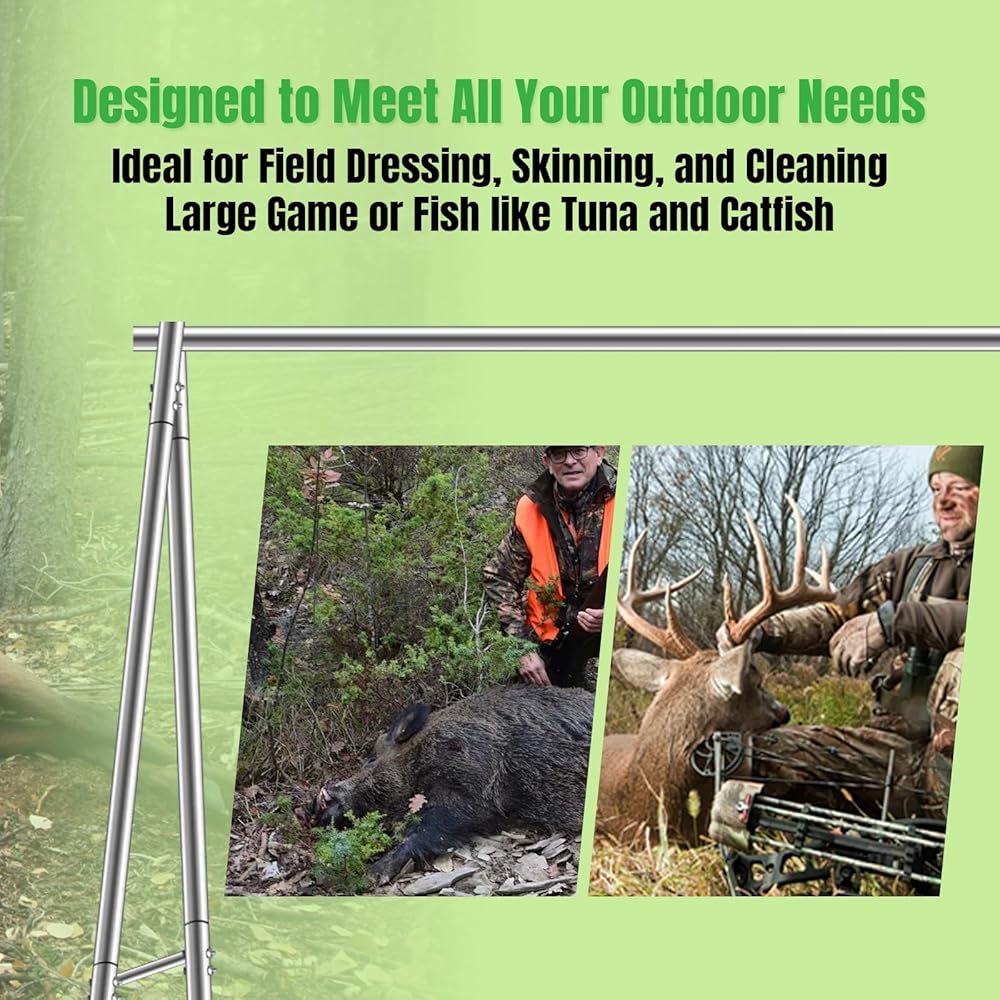 • نظام بكرة رافعة الغزلان: تشتمل مجموعة رافعة اللعبة للغزلان على رافعة شديدة التحمل، وبكرة، ومقامرة لتعليق الغزلان بشكل آمن. يضمن تصميم شماعات الغزلان رفعًا سلسًا ومستقرًا وسهولة التحكم أثناء السلخ والتضميد والمعالجة. مثالية للصيادين والصيادين، تدعم معدات تجهيز لحوم الغزلان هذه تضميد الحقول أو سلخها أو تنظيف الأسماك الكبيرة مثل سمكة العلم أو التونة ذات الزعانف الزرقاء أو سمك السلور.