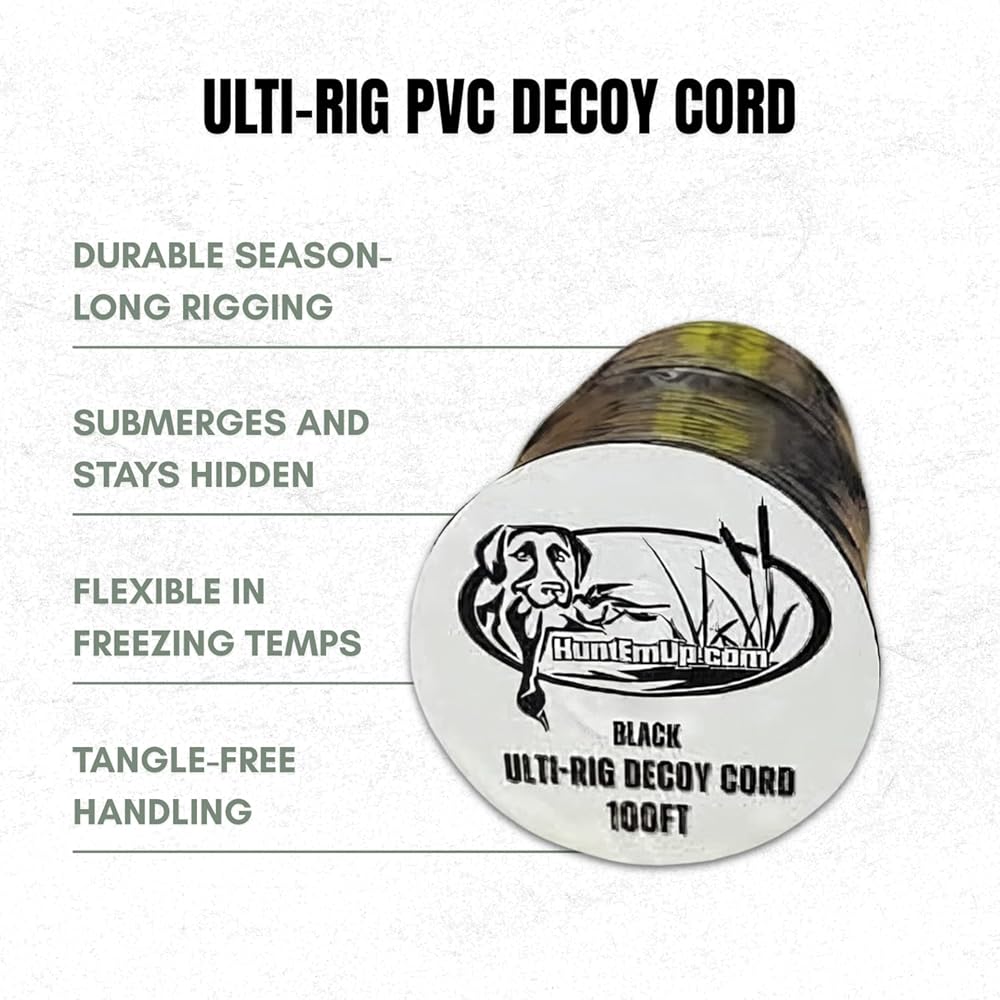 The HuntEmUp Ulti-Rig 100ft Decoy Cord is designed for waterfowl hunters who demand clean, dependable rigging that holds up through every type of condition the season throws at them. Made from a premium PVC formulation, this line offers the ideal balance of durability, flexibility, and controlled stretch, giving you a rig that handles smoothly whether you're setting decoys in shallow marsh grass or knee-deep timber.