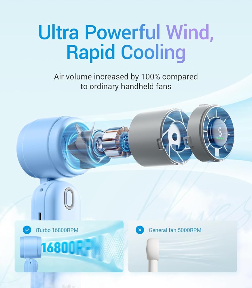 🚀 تبريد بسرعة Jet-Speed - أقوى 3 مرات اشعر بالانتعاش الفوري مع رياح توربو تبلغ سرعتها 9.2 متر/ثانية، أقوى 3 مرات من المراوح العادية. توفر تقنية iTurbo تبريدًا عالي السرعة أينما ذهبت.