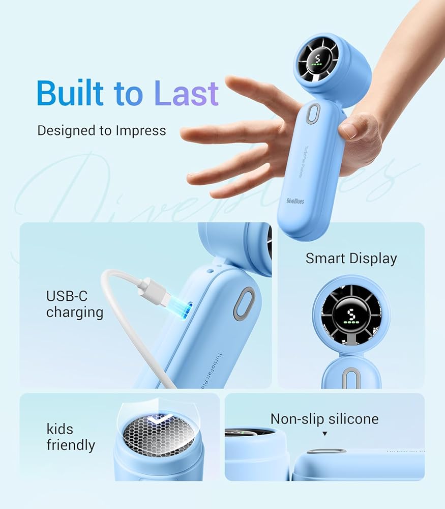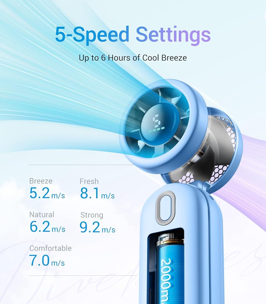 🌬️5 Gear Turbo Wind – اختر من بين 5 سرعات قابلة للتعديل للحصول على نسيم مثالي، من العواصف الخفيفة إلى الرياح القوية. تعرض شاشة LED سرعة الرياح وعمر البطارية 🔋، مما يتيح لك التحكم.