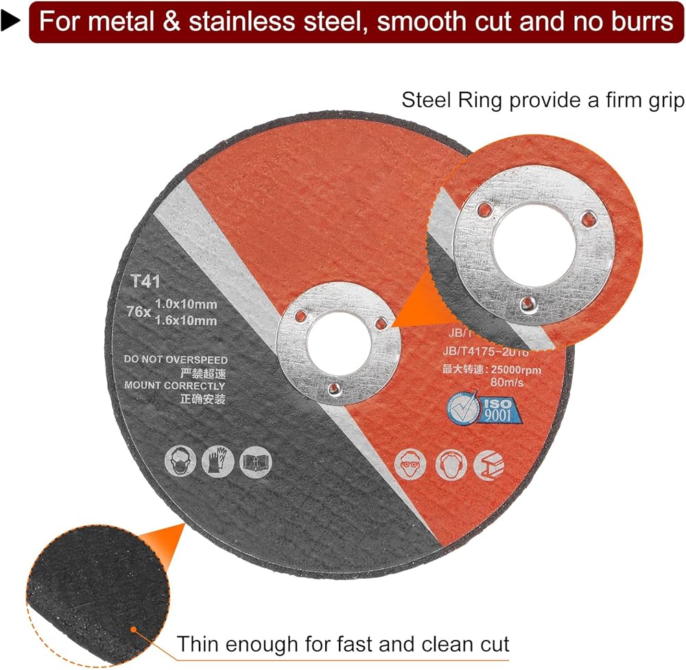 الحجم - قطر 3 بوصات / 76 مم، سمك 0.04 بوصة / 1 مم، 0.39 بوصة / 10 مم. يضمن التصميم الرفيع قطعًا نظيفة وسريعة مع تقليل إنتاج النفايات المعدنية والغبار.