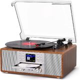 مشغل تسجيل بلوتوث 10 في 1 مع مكبرات صوت ستيريو مدمجة | قرص دوار الكل في واحد بثلاث سرعات للفينيل والأقراص المضغوطة وMP3 وUSB/SD وراديو الإنترنت | تسجيل MP3 | مركز الوسائط المتعددة خمر