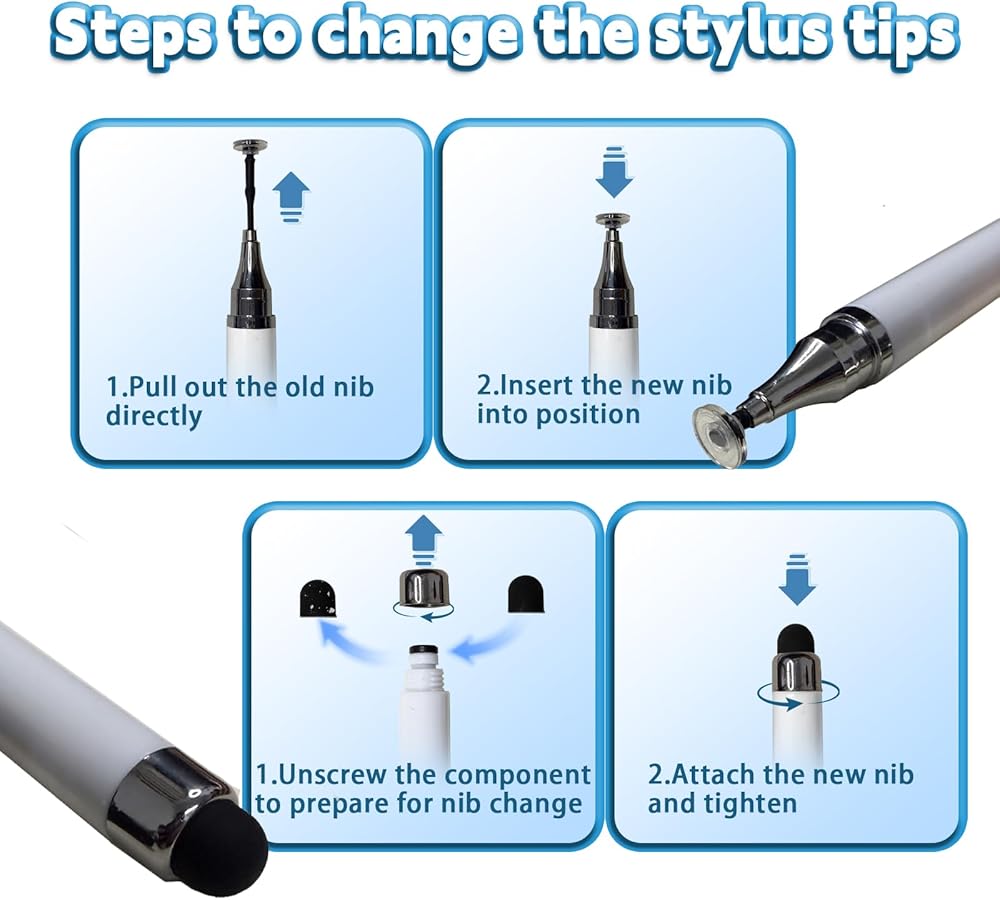 تتضمن العبوة: تحتوي كل عبوة على 12 قلمًا بأربعة ألوان، بالإضافة إلى 4 أطراف مطاطية و4 مجموعات بديلة لأطراف الأقراص الشفافة، ومشبك زنبركي عمودي (لتأمين قلم القلم في علبة الكمبيوتر اللوحي). تسمح الأجزاء البديلة بسهولة الاستبدال وإطالة عمر القلم بشكل فعال