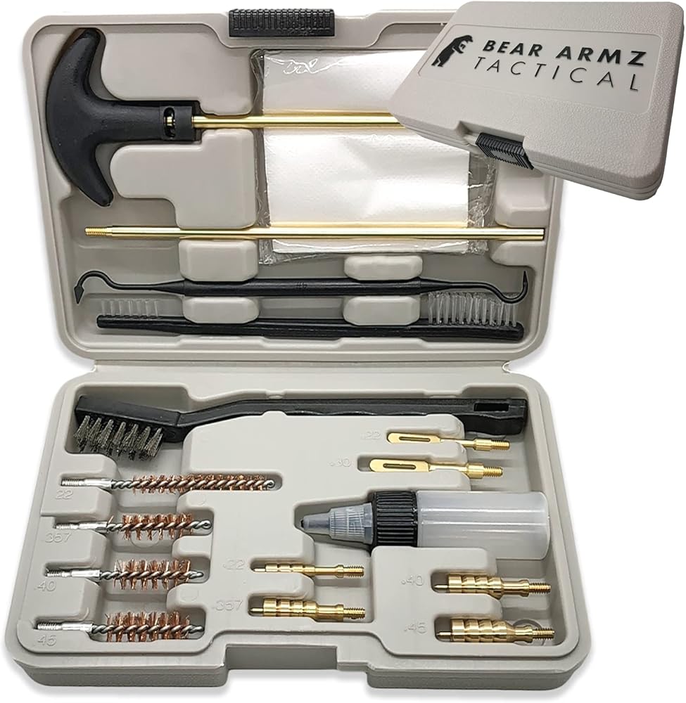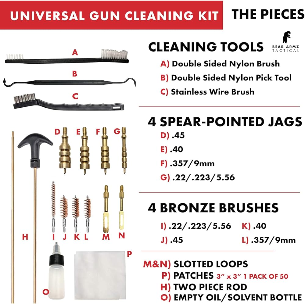 المجموعة: نحن نقدم مجموعة أدوات تنظيف متينة يمكن استخدامها لتنظيف معظم أنواع المسدسات والمسدسات وبعض SBRs. تسمح لك مجموعتنا بالحفاظ على جميع بنادقك في حالة تشغيل ممتازة.