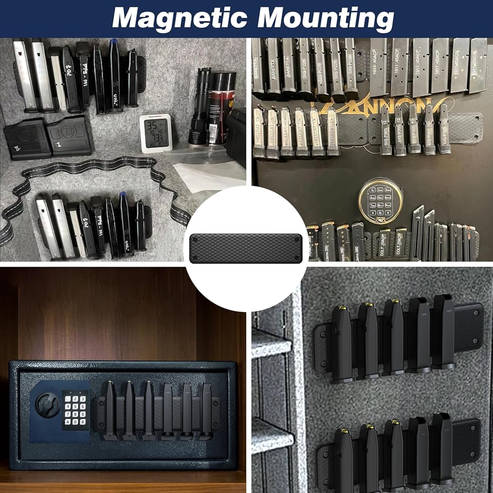 نظام إدارة الفضاء الذكي ✓ توافق متعدد الأبعاد: التكيف مع Glock/Magpul/PMAG و97% أخرى من مواصفات المجلات المتاحة تجاريًا (معيار الصناعة 9.6 × 2.5 × 0.2 بوصة) ✓ تنبيه المواد: مصمم لمجلات السبائك القائمة على الحديد (ليس للمواد غير المغناطيسية مثل الألومنيوم/النحاس/الرصاص) ✓ تحسين المساحة: حل التخزين العمودي يحرر المساحة 76% من مساحة التخزين التقليدية