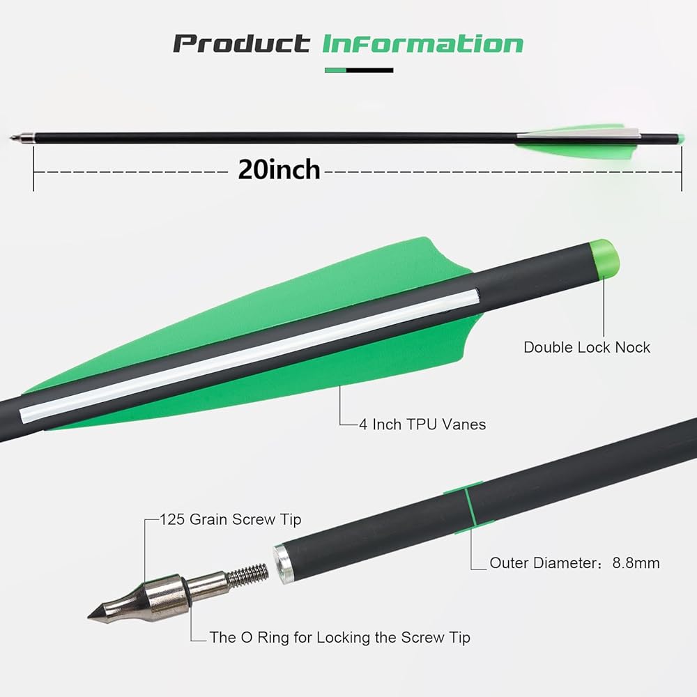 • الحزمة الكاملة: سوف تتلقى مجموعة شاملة من الأساسيات. يتضمن ذلك 12 سهمًا ممتازًا للقوس مقاس 20 بوصة، و12 طرفًا قابلاً للتبديل بوزن 125 حبة، و6 رؤوس عريضة عالية القوة بوزن 100 حبة. كل ما تحتاجه لتجربة صيد ناجحة!
