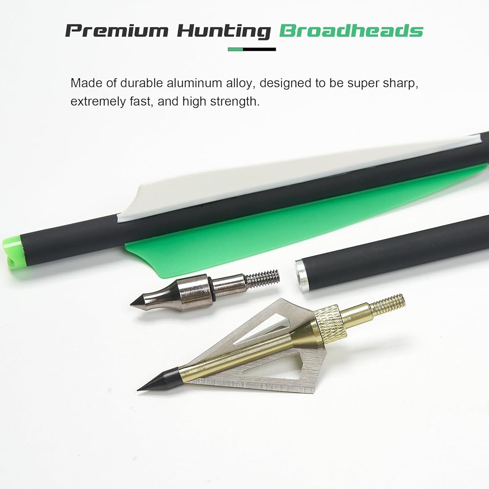 • رؤوس عريضة للصيد ممتازة: تأتي سهام الصيد ذات القوس والنشاب مع رؤوس سهام قابلة للاستبدال مكونة من 125 حبة، ولكن هذا ليس كل شيء! نوفر لك أيضًا 6 رؤوس عريضة للصيد مصنوعة من سبائك الألومنيوم المتينة. تم تصميم هذه الرؤوس العريضة لتكون حادة للغاية وسريعة للغاية وقوة عالية، مما يسمح بقابلية تبادل سلسة بناءً على احتياجاتك.