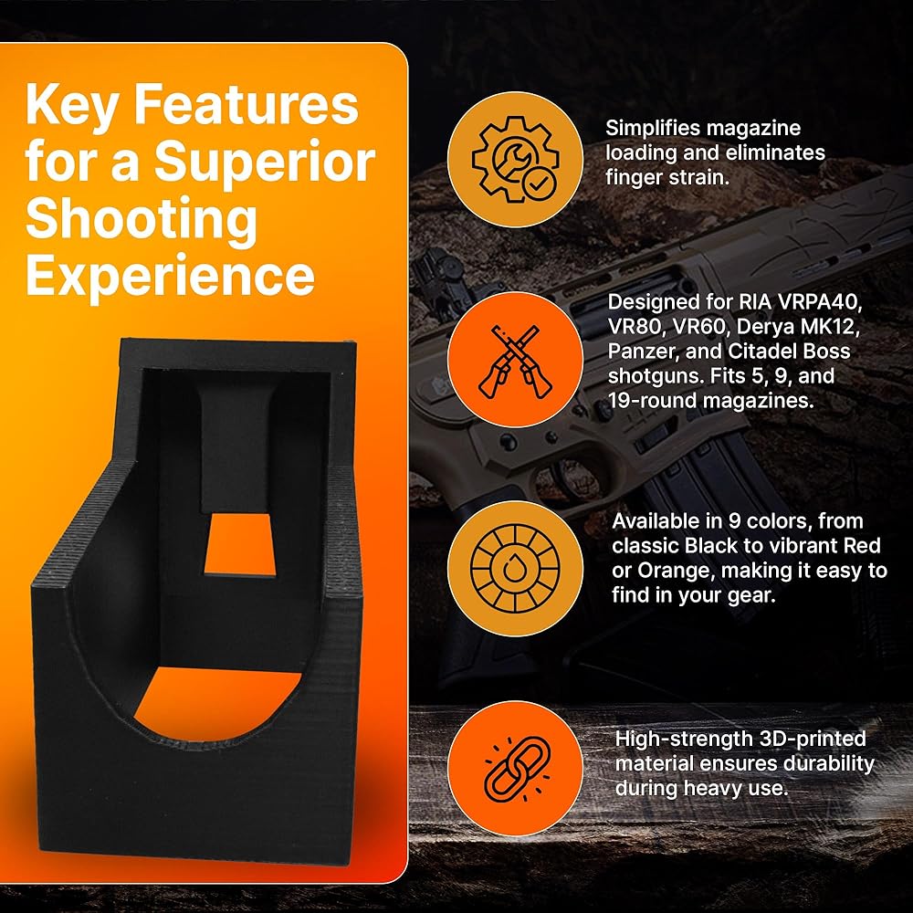 WIDE COMPATIBILITY: This versatile mag speed loader is specifically engineered to fit RIA VRPA40, VRBP-100, VR80, VR60, Derya MK12, Panzer, and Citadel Boss shotguns. Works flawlessly with 5, 9, and 19 round magazines, ensuring versatility across your firearm collection.