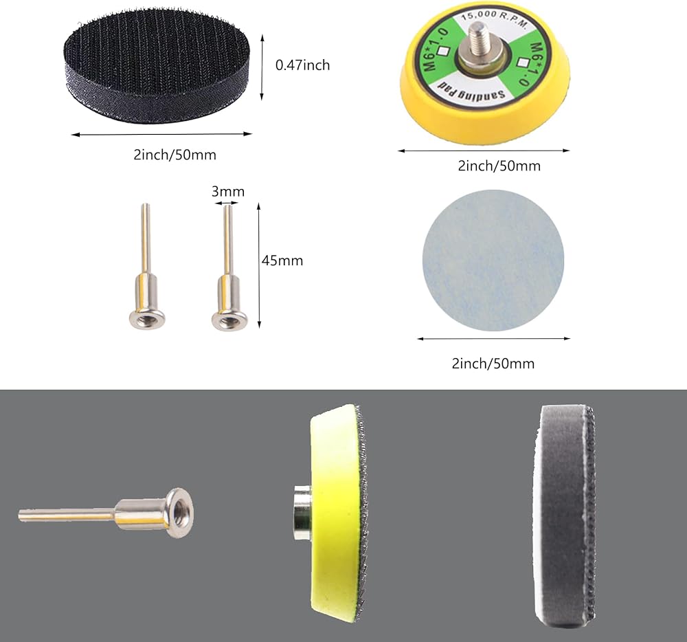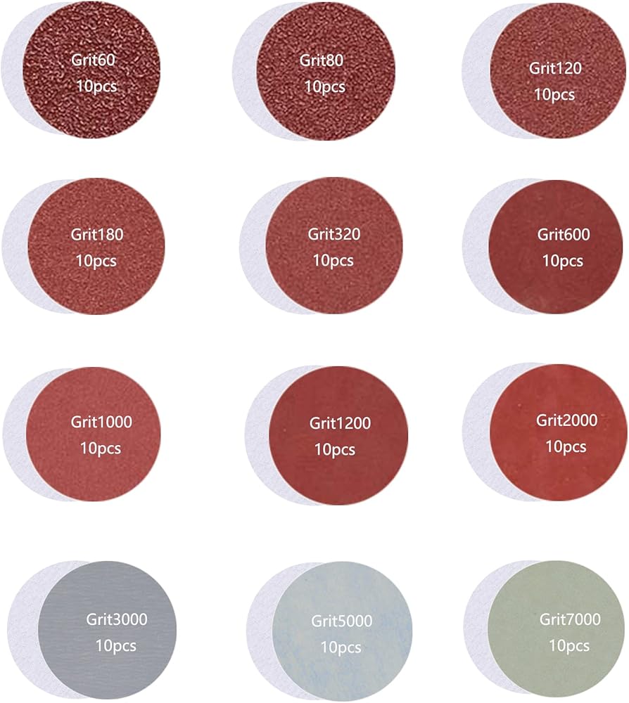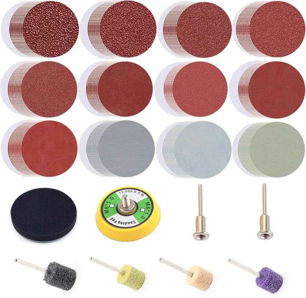 ✔ مجموعة متنوعة من أقراص الصنفرة 128 قطعة - 128 قطعة أقراص صنفرة حمراء بخطاف وحلقة مقاس 2 بوصة (حبيبات 60/80/120/180/320/600/1000 /1200/2000/ 3000/5000/7000 كل 10 قطع)، قطعة واحدة من وسادات التخزين المؤقت، قطعة واحدة وسادة صنفرة مع قطعتين من السيقان المستديرة مقاس 3 مم، و4 قطع من رأس طحن الألياف.