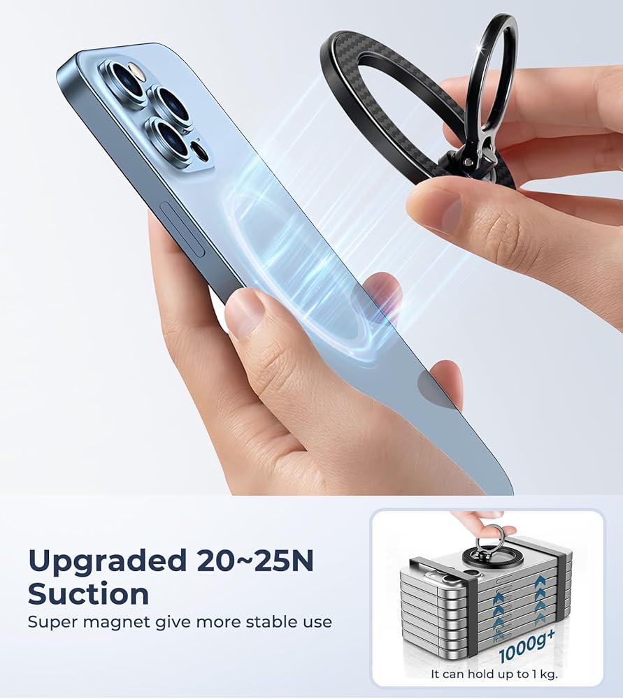 【مغناطيس قوي للغاية】 مغناطيسية فائقة تبلغ 4.4 رطل (20-25 نيوتن أو 2 كجم - تحمل وزن 3 صور iPhone)، يمكن أن يتم تثبيت المقبض الدائري للهاتف المغناطيسي هذا بقوة على سلسلة iPhone 15/14/13/12، بالإضافة إلى حافظات الهاتف المغناطيسية أو الأجهزة غير الآمنة. علاوة على ذلك، فإننا نقدم حلقة معدنية إضافية في الصندوق تصل سعة الحمل القصوى إلى 4.5 كجم. تضمن المغناطيسات المدمجة القوية المستخدمة في مقبض الهاتف هذا التوافق الصحيح مع جهازك المتوافق مع جهاز MagSafe. من السهل تركيب حامل الهاتف الخلوي المغناطيسي وفصله للشحن اللاسلكي، دون ترك أي بقايا لزجة.