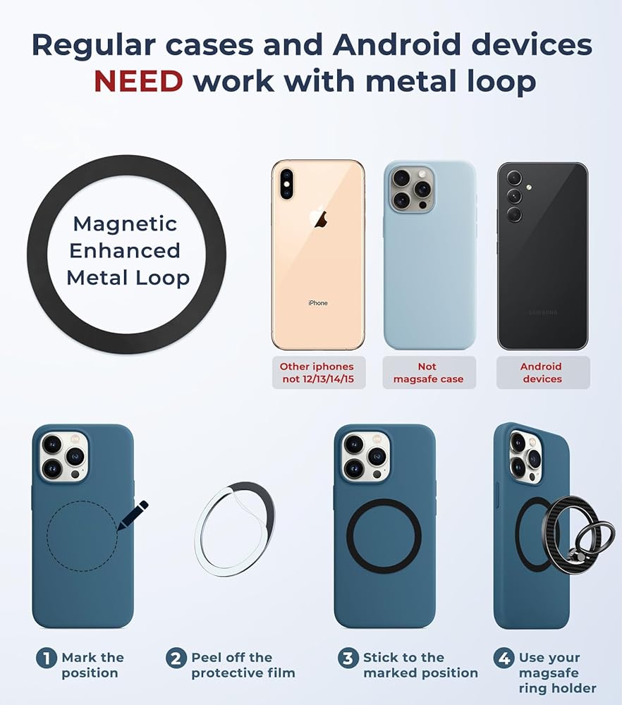 【توافق واسع】 ❗❗ملاحظة: في حالة استخدام حافظات iPhone العادية غير المغناطيسية وهواتف Android مثل Samsung S21 أو S22 أو Galaxy S23 Series أو google Pixel أو هواتف Android الأخرى إلخ. يجب استخدام الحلقة المعدنية الموجودة خارج علبة الهاتف لتعزيز المغناطيس.
