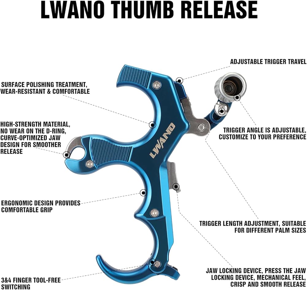 LWANO Thumb Release uses 6061-T6 aluminum alloy and high carbon steel internal materials to ensure smooth and stable release. Travel and pressure adjustments, Ergonomic design handle, thumb trigger angle adjustment, Sensitive release, excellent hand feel. Make it the choice for any shooter who wants more success