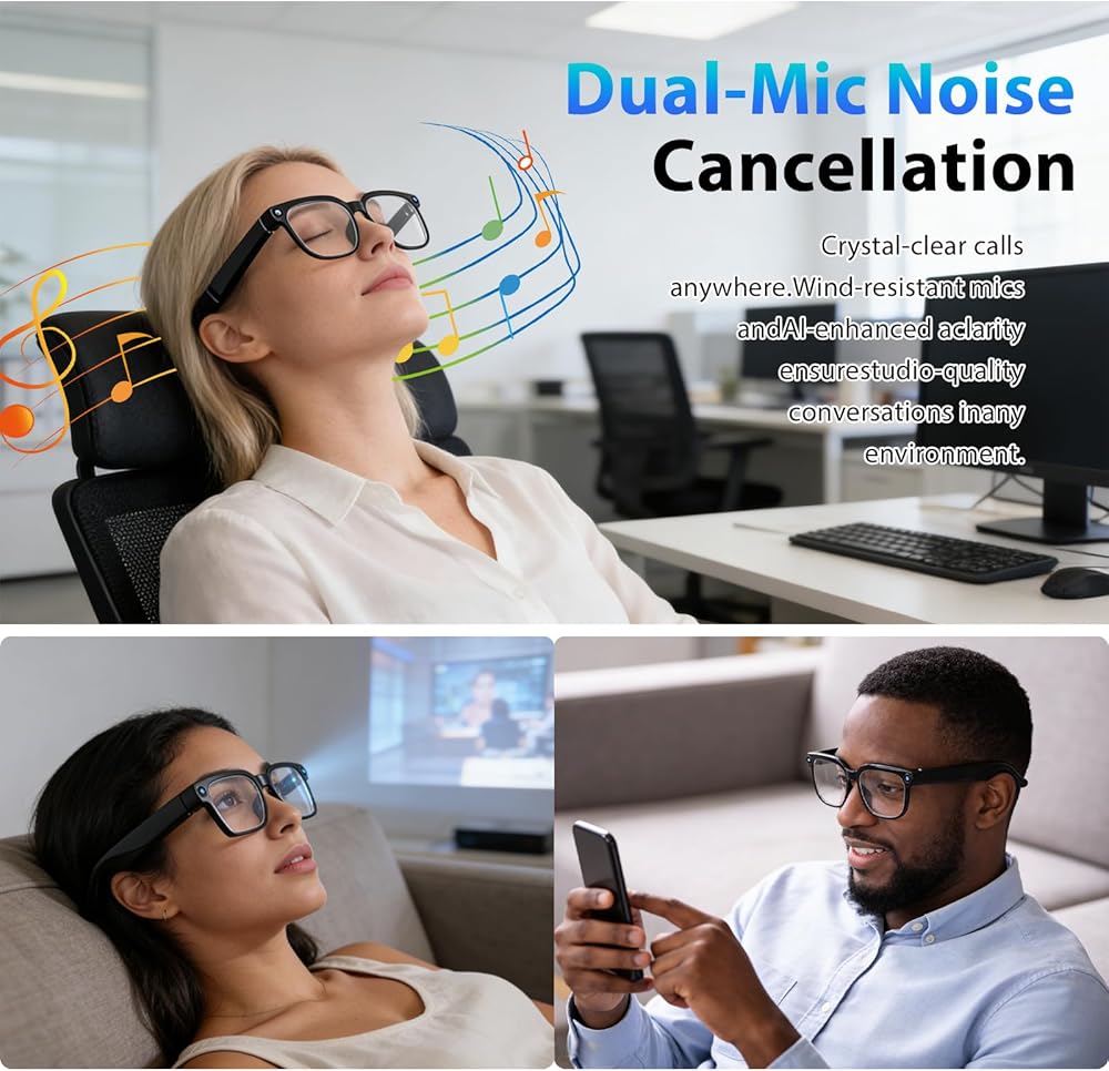 • تصميم أنيق وارتداء مريح، تبرز في النزهات اليومية: تتميز هذه النظارات الذكية للرجال والنساء، المصممة بمظهر أنيق ومواكبة للموضة، بمفصلات معدنية تضفي جودة ممتازة. سواء كنت تتنقل أو في تجمع الأصدقاء، فهي بمثابة إكسسوار مذهل. تضمن وسادات الأنف القابلة للتعديل ملاءمة مثالية لجسور الأنف المختلفة، مما يجعلك تشعر بالراحة حتى أثناء ساعات طويلة من الارتداء - مثالية للاستخدام اليومي.