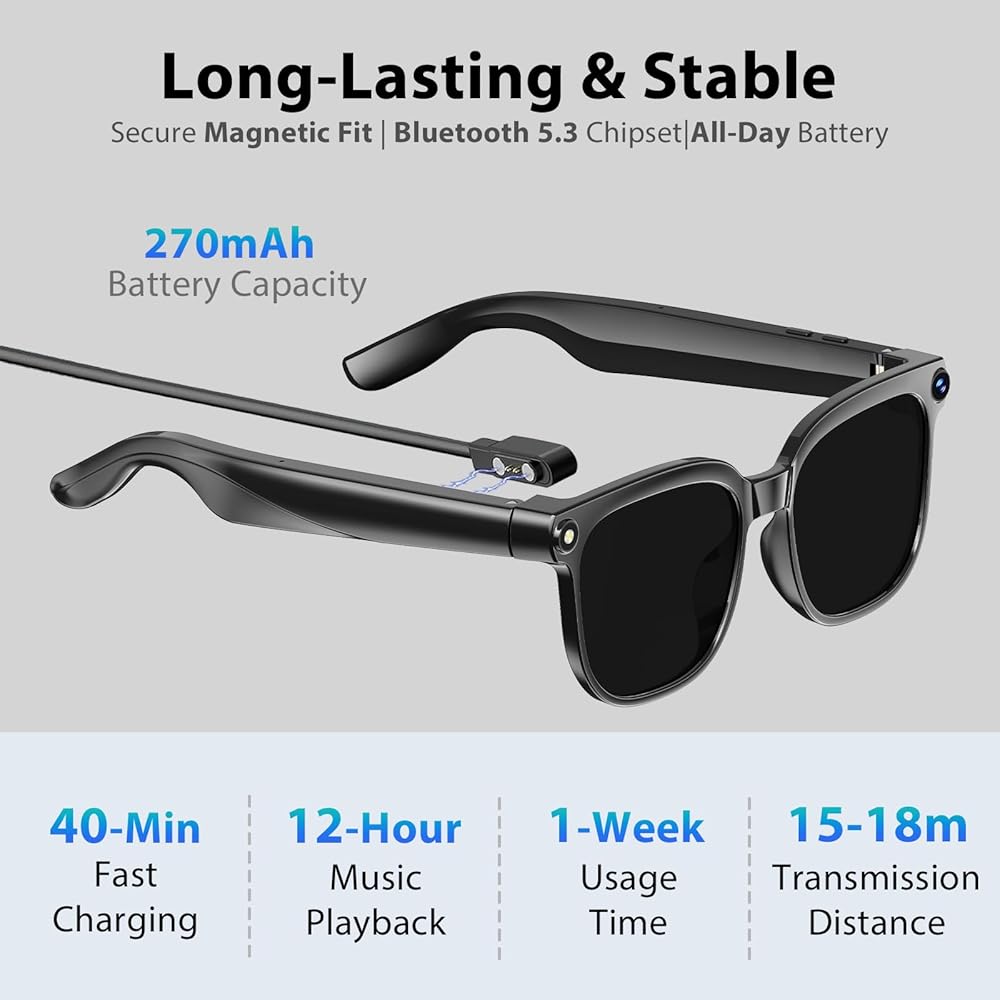 • بطارية طويلة الأمد وشحن مريح، السفر دون قلق: مدعومة ببطارية قوية، توفر نظارات الكاميرا هذه طوال اليوم، وتلبي متطلبات الرحلات اليومية الكاملة أو رحلات العمل. ويعني تصميم الشحن المغناطيسي أنه يمكنك ببساطة توصيلها بالشاحن ليلاً في فندقك أو مكتبك لشحن سريع وخالي من المتاعب، مما يوفر الوقت ويزيل القلق بشأن البطارية.