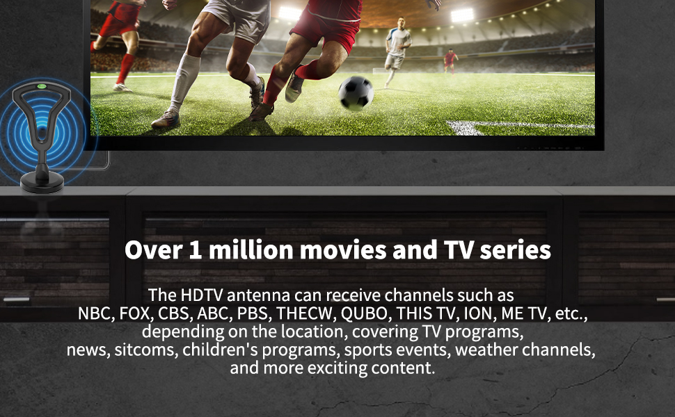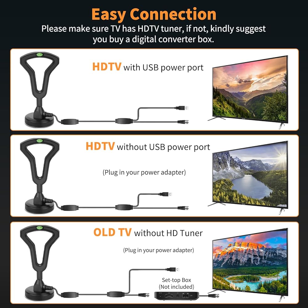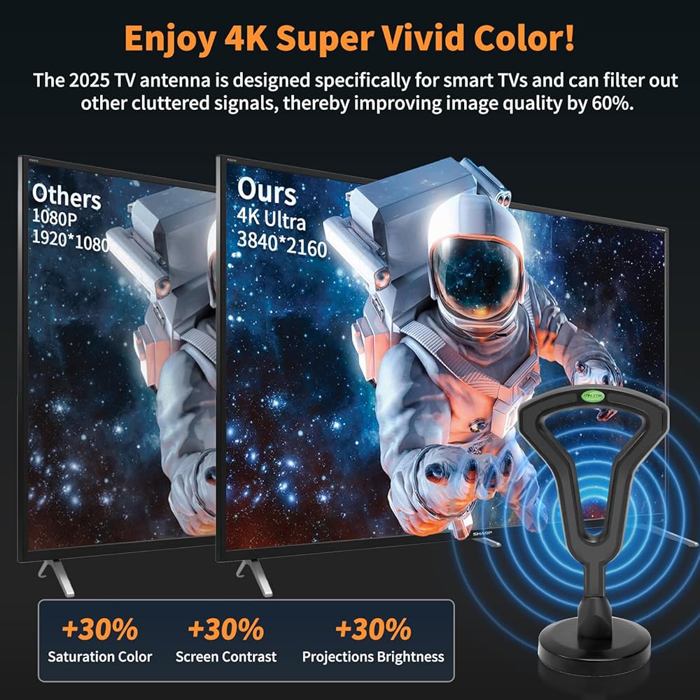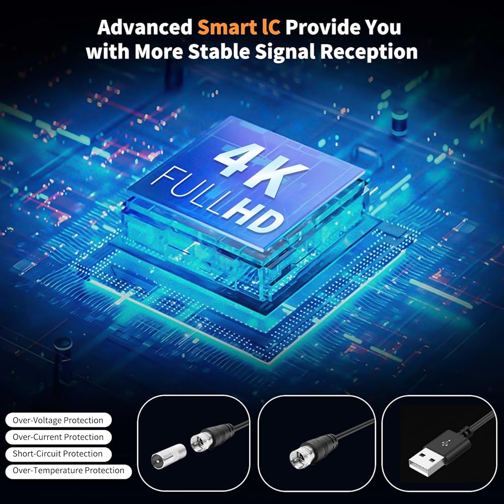 استقبال إشارة واسع النطاق: يحتوي هوائي التلفزيون عالي الدقة الداخلي الذي تمت ترقيته لعام 2025 على شريحة IC ذكية مدمجة تعمل على تحسين استقبال الإشارة وتغطي نطاقًا يصل إلى 130+ ميلًا. قد يختلف الاستقبال الفعلي حسب المسافة التي تفصلك عن برج البث أو هيكل المبنى أو الظروف الجوية. للحصول على أفضل تجربة مشاهدة، يرجى التثبيت والضبط وفقًا للتعليمات الواردة في الدليل المرفق.