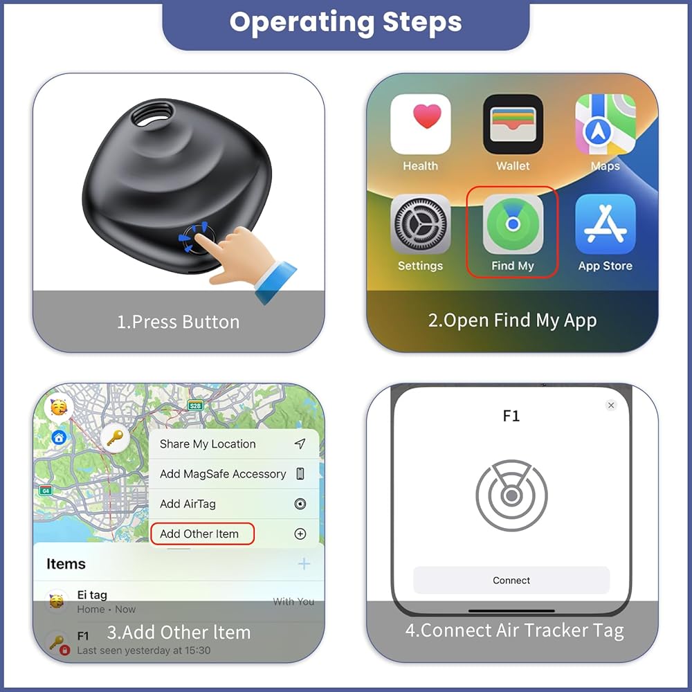 كيفية إقران علامة التعقب الخاصة بك: اضغط مع الاستمرار على زر الوظيفة لمدة 5 ثوانٍ لتشغيلها. افتح تطبيق "Find My"، وحدد العناصر > إضافة عنصر جديد (+) > إضافة عنصر آخر. عندما يظهر "F1"، انقر للاتصال وقم بتعيين اسم ورمز مخصصين لعملية إعداد بسيطة وسريعة.