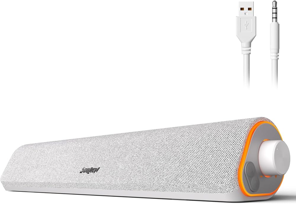 سماعات كمبيوتر بلوتوث SOULION R50، سماعات كمبيوتر تعمل بمنفذ USB لشاشة سطح المكتب، مصابيح LED سلكية وملونة 3.5 مم، شريط صوت محيطي للكمبيوتر المحمول، أبيض
