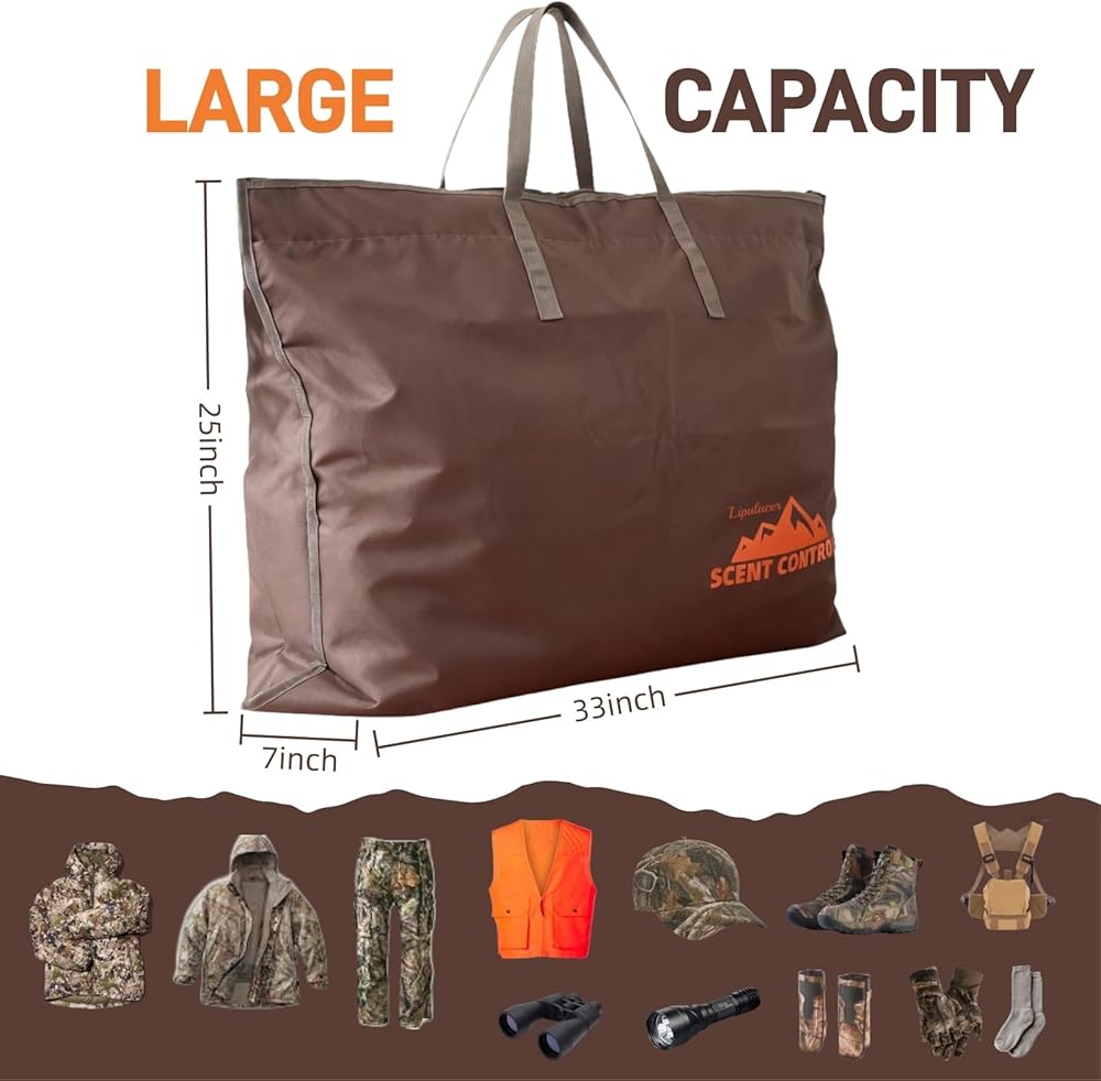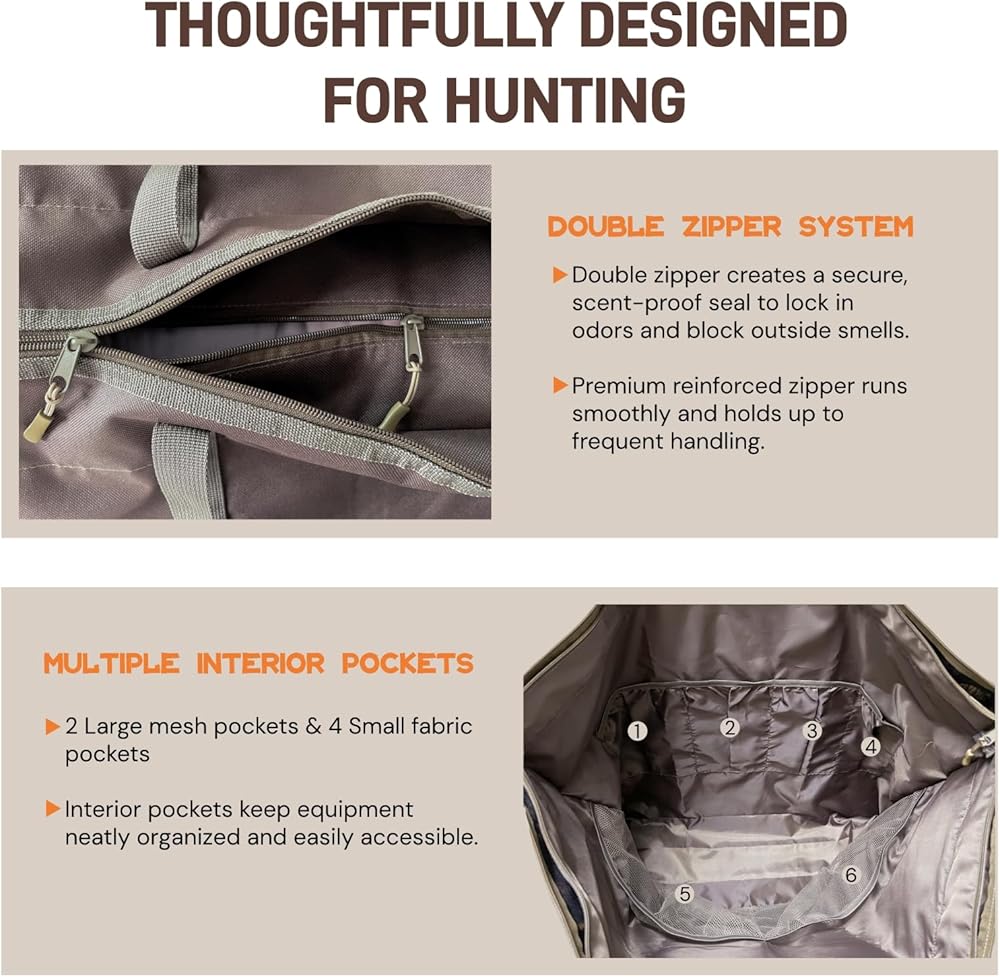 سعة كبيرة وجيوب تخزين داخلية متعددة: يبلغ مقاس حقيبة قفل الرائحة 33 × 25 بوصة، مما يوفر مساحة واسعة لملابسك المموهة، وبدلة غيلي، وشبكة مموهة، وقبعة، وقناع، وأحذية الصيد، وغيرها من معدات الصيد الأساسية. مصمم بعناية مع جيوب داخلية متعددة، فهو يحافظ على كل شيء منظمًا وفي متناول اليد. جيبان شبكيان كبيران يفصلان الملابس والأحذية، بينما تستوعب أربعة جيوب قماشية الملحقات الصغيرة مثل المصابيح الكهربائية والقفازات والطعام والبسكويت. تساعد هذه الجيوب الصيادين على تنظيم معداتهم بشكل أنيق وتجهيزهم بسرعة، والحفاظ على التركيز على الصيد